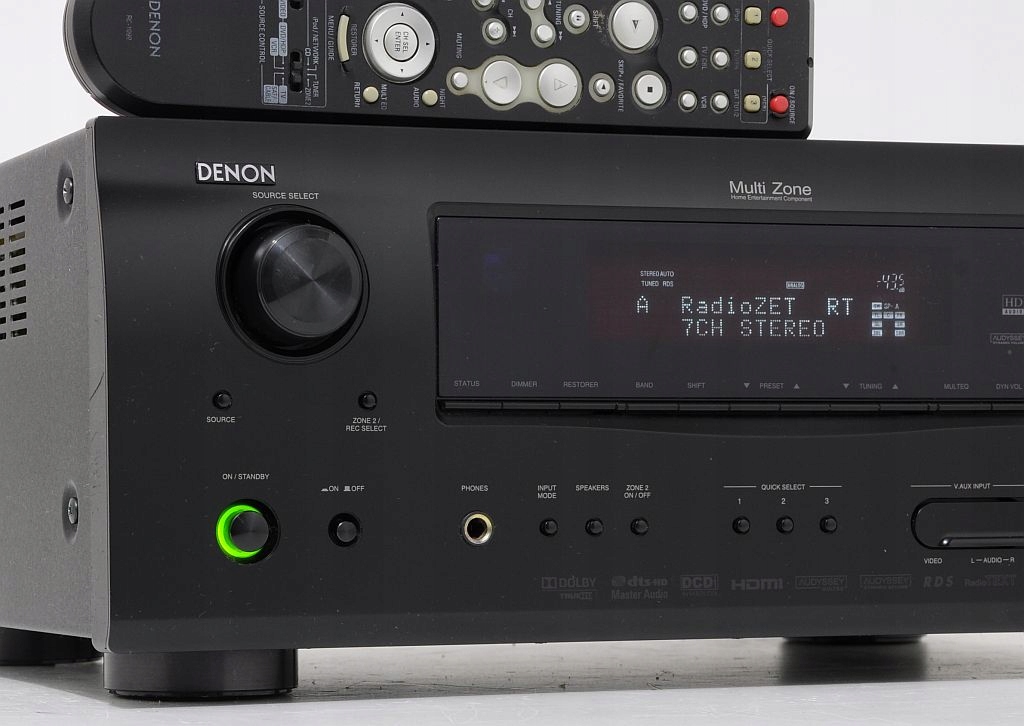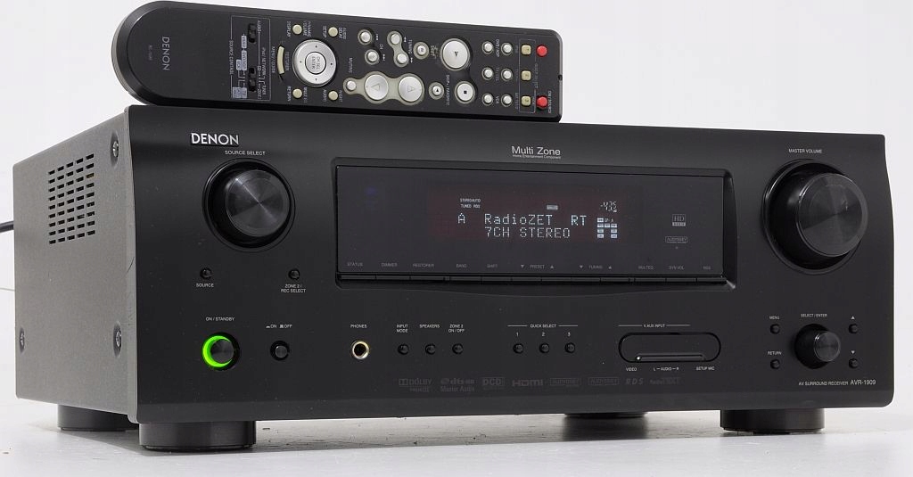 Denon AVR-1909 to amplituner AV klasy premium, zaprojektowany z myślą o miłośnikach dźwięku przestrzennego oraz najwyższej jakości obrazu. Ten model japońskiego producenta łączy nowoczesne technologie przetwarzania audio-wideo z legendarną precyzją i solidnością wykonania marki Denon. Oferuje 7 kanałów audio o mocy 90 W (8 Ω) lub 120 W (6 Ω) każdy, co pozwala stworzyć pełny system kina domowego 7.1 z potężnym i czystym brzmieniem. Dzięki skalowaniu obrazu do 1080p (Faroudja DCDi) oraz obsłudze standardu HDMI 1.3a, AVR-1909 sprawdzi się doskonale w zestawie z telewizorem HD lub projektorem.Denon AVR-1909 oferuje dźwięk o wyjątkowej przejrzystości i dynamice. Bas jest głęboki, średnie pasmo czytelne, a wysokie tony naturalne i dobrze zrównoważone. Wielokanałowe ścieżki filmowe brzmią przestrzennie i kinowo, a w trybie stereo amplituner zachowuje muzykalność i detaliczność typową dla urządzeń Denona.