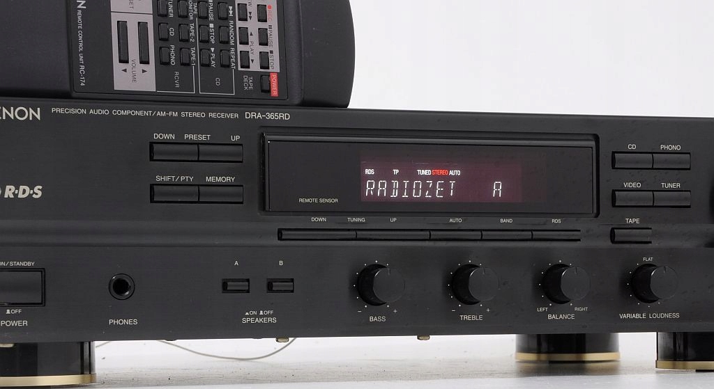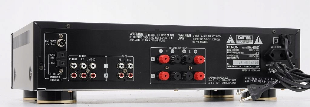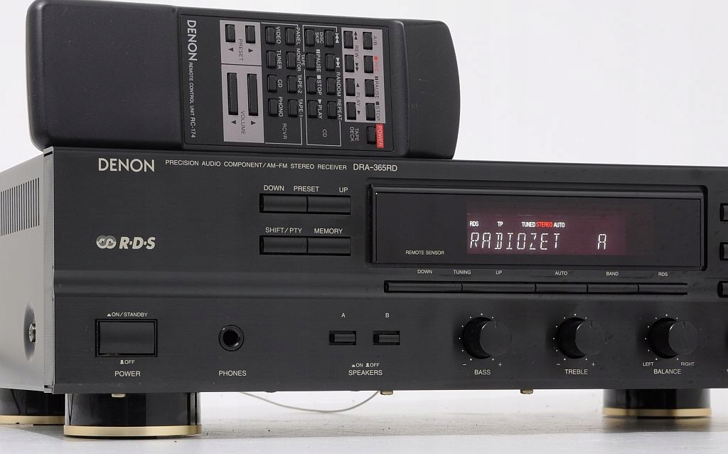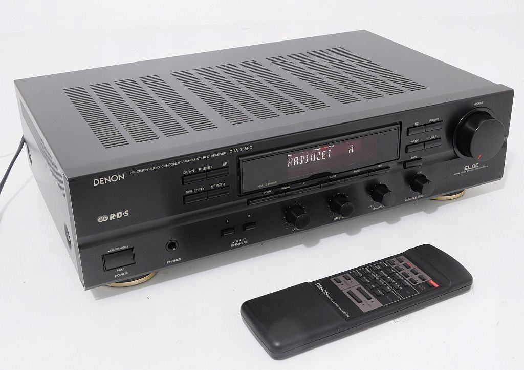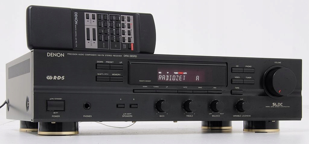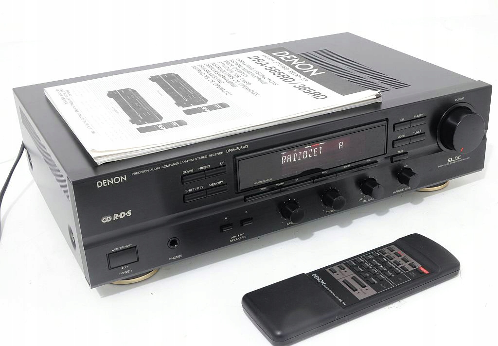 Stosunkowo świeży produkt firmy DENON, występujący jeszcze nie tak dawno na półkach sklepowych. Konstrukcja dobrze oceniana w prasie audio (HiFi test , ocena bardzo dobry, „żaden nie zagrał tak swobodnie, przestrzennie i precyzyjnie...”) jak i przez samych użytkowników. Firmie Denon doskonale udało się połączyć zintegrowany wzmacniacz stereo z tunerem, do tego stopnia, że bez obaw DRA-365RD można porównywać z podstawowym modelem wzmacniacza Denon z serii New Optical Class A. Wykonany zgodnie ze starymi wytycznymi, końcówka mocy oparta na 4 tranzystorach (po 2 na kanał), kondensatorach o słusznej pojemności oraz solidnym zabudowanym transformatorze. Dodatkowo zastosowano zasadę S.L.D.C – przy dyskretnej strukturze poszczególnych obwodów zapewnia minimalne wzajemne oddziaływanie podzespołów. Ma to oczywiście korzystny wpływ na dźwięk. Urządzenie bardzo funkcjonalne wyposażone w system RDS oraz regulator - płynnie regulowany LOUD. Amplituner można rozbudować o 3 dodatkowe urządzenia +gramofon, na tylniej ściance znajduje się dodatkowe gniazdo AC do podpięcia (zasilanie) innego segmentu systemu. Sekcja tunera sprawuje się wyśmienicie, nie ma wygórowanych wymagań wobec anteny – na wewnętrznej, pokojowej odbiera bezproblemowo wszystkie dostępne rozgłośnie. Czołówka wykonana z aluminium, wyświetlacz świeci równomiernie na całej swojej długości jest przejrzysty, czyściutki. Jest dużo fotek do oglądnięcia i na ich podstawie mogą Państwo dokonać samooceny, w razie wątpliwości proszę śmiało pytać.