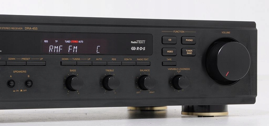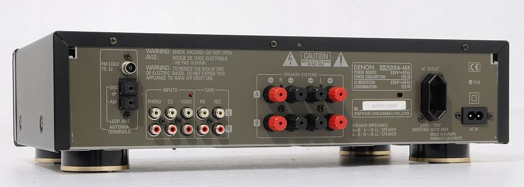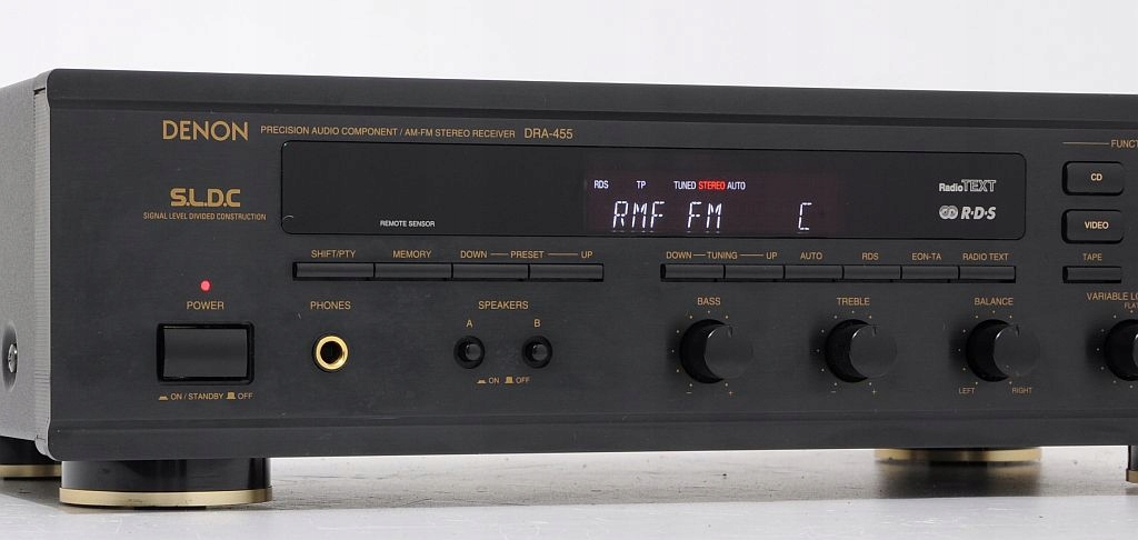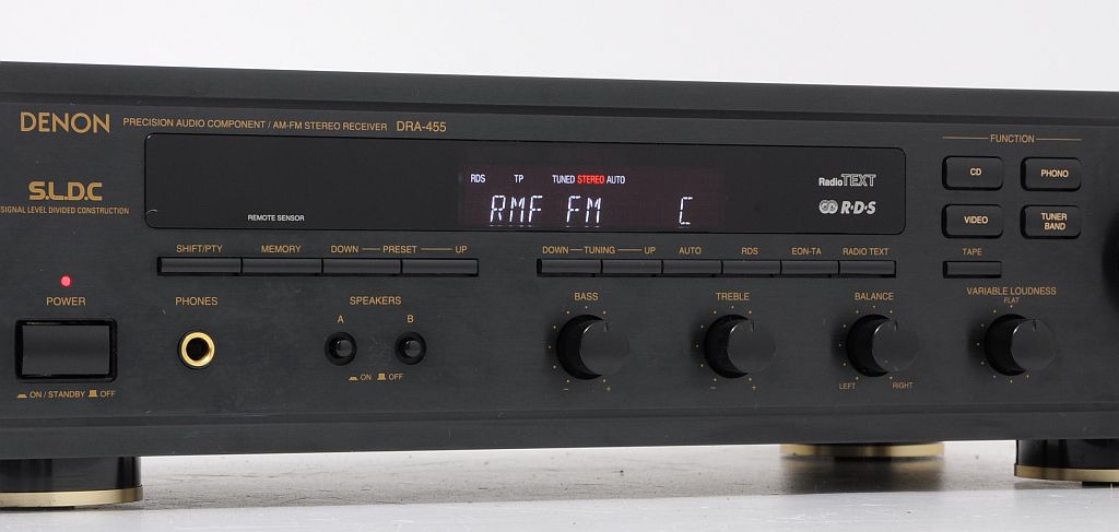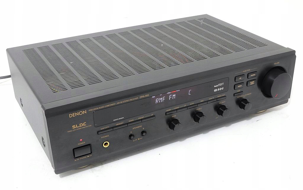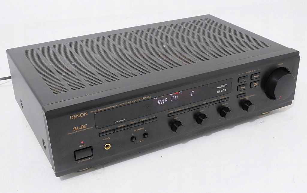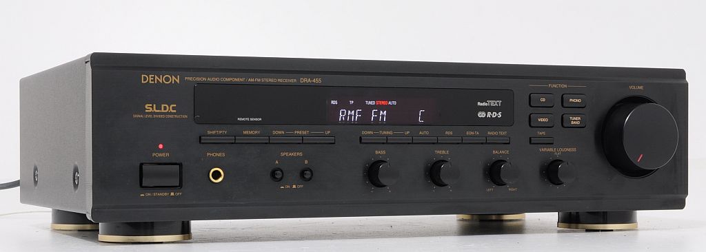 Stosunkowo świeży produkt firmy DENON, występujący jeszcze nie tak dawno na półkach sklepowych. Konstrukcja dobrze oceniana w prasie audio (HiFi test , ocena bardzo dobry, „żaden nie zagrał tak swobodnie, przestrzennie i precyzyjnie...”) jak i przez samych użytkowników. Firmie Denon doskonale udało się połączyć zintegrowany wzmacniacz stereo z tunerem, do tego stopnia, że bez obaw DRA-455 można porównywać z modelami wzmacniaczy Denon już z serii New Optical Class A. Wykonany zgodnie ze starymi wytycznymi, końcówka mocy oparta na 4 tranzystorach (po 2 na kanał), kondensatorach o słusznej pojemności oraz solidnym zabudowanym transformatorze. Dodatkowo zastosowano zasadę S.L.D.C – przy dyskretnej strukturze poszczególnych obwodów zapewnia minimalne wzajemne oddziaływanie podzespołów. Ma to oczywiście korzystny wpływ na dźwięk. Urządzenie bardzo funkcjonalne wyposażone w system RDS oraz regulator - płynnie regulowany LOUD. Amplituner można rozbudować o 3 dodatkowe urządzenia + gramofon, na tylniej ściance znajduje się dodatkowe gniazdo AC do podpięcia (zasilanie) innego segmentu systemu. Sekcja tunera sprawuje się wyśmienicie, nie ma wygórowanych wymagań wobec anteny – na wewnętrznej, pokojowej odbiera bezproblemowo wszystkie dostępne rozgłośnie. Czołówka wykonana z aluminium, wyświetlacz świeci równomiernie na całej swojej długości jest przejrzysty, czyściutki. Jest dużo fotek do oglądnięcia i na ich podstawie mogą Państwo dokonać samooceny, w razie wątpliwości proszę śmiało pytać.