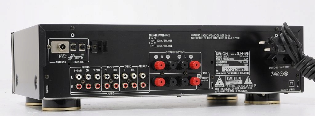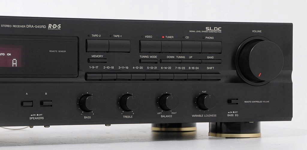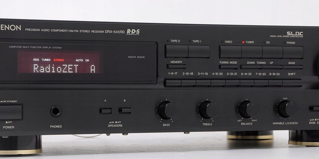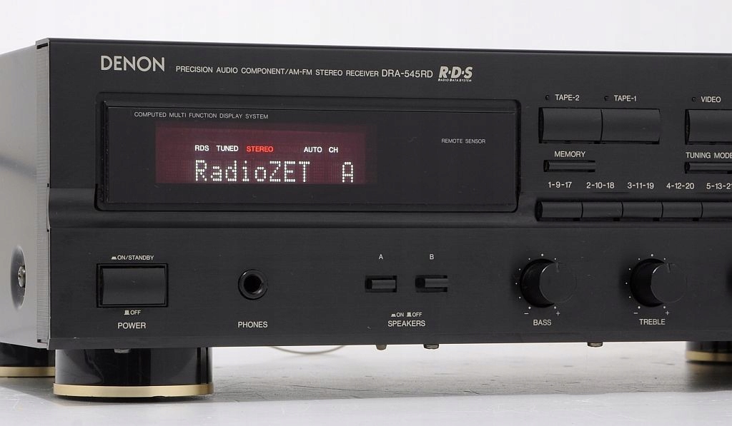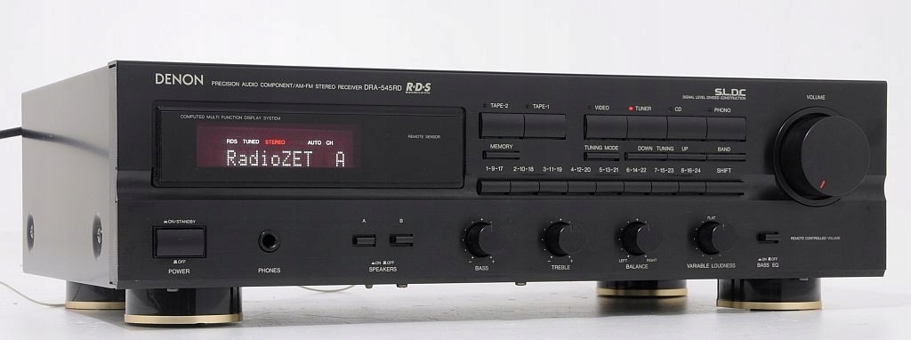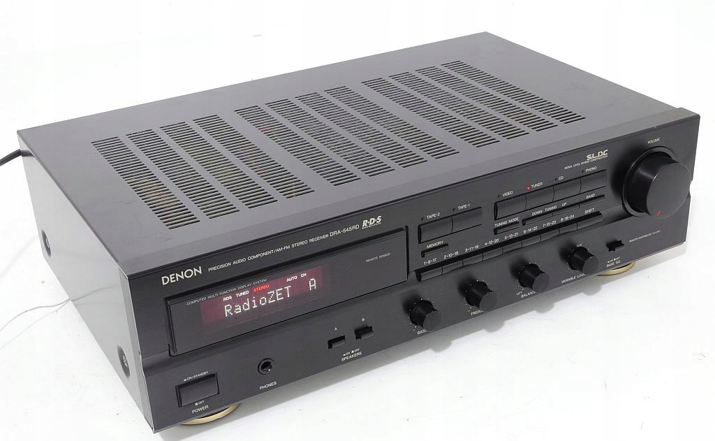Stosunkowo świeży produkt firmy DENON, występujący jeszcze nie tak dawno na półkach sklepowych. Konstrukcja dobrze oceniana w prasie audio (HiFi test , ocena bardzo dobry, „żaden nie zagrał tak swobodnie, przestrzennie i precyzyjnie...”) jak i przez samych użytkowników. Firmie Denon doskonale udało się połączyć zintegrowany wzmacniacz stereo z tunerem, do tego stopnia, że bez obaw DRA-545RD można porównywać z modelami wzmacniaczy Denon już z serii New Optical Class A. Wykonany zgodnie ze starymi wytycznymi, końcówka mocy oparta na 4 tranzystorach (po 2 na kanał), kondensatorach o słusznej pojemności oraz solidnym zabudowanym transformatorze. Dodatkowo zastosowano zasadę S.L.D.C – przy dyskretnej strukturze poszczególnych obwodów zapewnia minimalne wzajemne oddziaływanie podzespołów. Ma to oczywiście korzystny wpływ na dźwięk. Urządzenie bardzo funkcjonalne wyposażone w system RDS oraz regulator - płynnie regulowany LOUD. Amplituner można rozbudować o 3 dodatkowe urządzenia + gramofon, na tylniej ściance znajduje się dodatkowe gniazdo AC do podpięcia (zasilanie) innego segmentu systemu. Sekcja tunera sprawuje się wyśmienicie, nie ma wygórowanych wymagań wobec anteny – na wewnętrznej, pokojowej odbiera bezproblemowo wszystkie dostępne rozgłośnie. Czołówka wykonana z aluminium, wyświetlacz świeci równomiernie na całej swojej długości jest przejrzysty, czyściutki. Jest dużo fotek do oglądnięcia i na ich podstawie mogą Państwo dokonać samooceny, w razie wątpliwości proszę śmiało pytać.