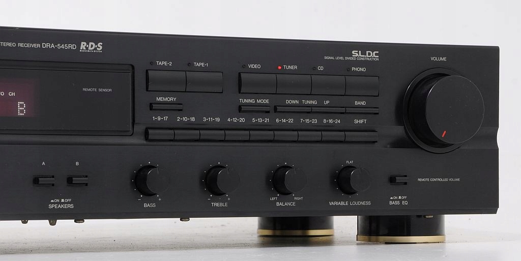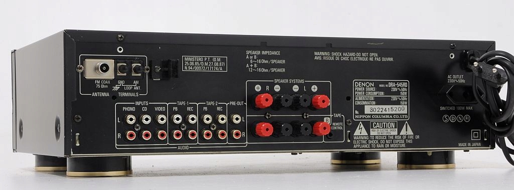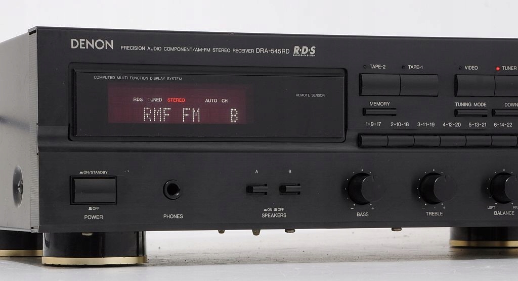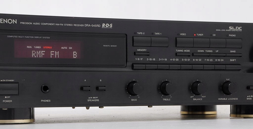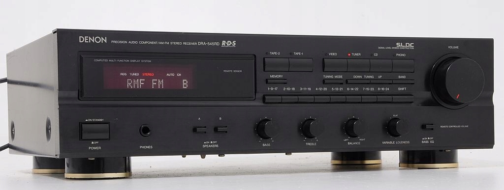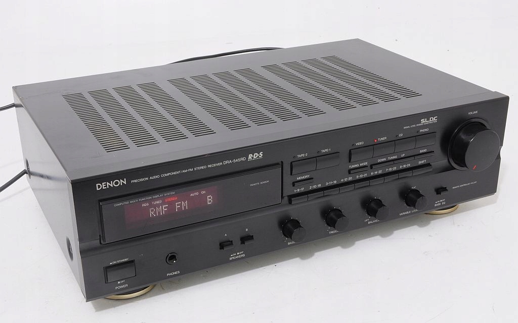 Stosunkowo świeży produkt firmy DENON, występujący jeszcze nie tak dawno na półkach sklepowych. Konstrukcja dobrze oceniana w prasie audio (HiFi test , ocena bardzo dobry, „żaden nie zagrał tak swobodnie, przestrzennie i precyzyjnie...”) jak i przez samych użytkowników. Firmie Denon doskonale udało się połączyć zintegrowany wzmacniacz stereo z tunerem, do tego stopnia, że bez obaw DRA-545RD można porównywać z modelami wzmacniaczy Denon już z serii New Optical Class A. Wykonany zgodnie ze starymi wytycznymi, końcówka mocy oparta na 4 tranzystorach (po 2 na kanał), kondensatorach o słusznej pojemności oraz solidnym zabudowanym transformatorze. Dodatkowo zastosowano zasadę S.L.D.C – przy dyskretnej strukturze poszczególnych obwodów zapewnia minimalne wzajemne oddziaływanie podzespołów. Ma to oczywiście korzystny wpływ na dźwięk. Urządzenie bardzo funkcjonalne wyposażone w system RDS oraz regulator - płynnie regulowany LOUD. Amplituner można rozbudować o 3 dodatkowe urządzenia + gramofon, na tylniej ściance znajduje się dodatkowe gniazdo AC do podpięcia (zasilanie) innego segmentu systemu. Sekcja tunera sprawuje się wyśmienicie, nie ma wygórowanych wymagań wobec anteny – na wewnętrznej, pokojowej odbiera bezproblemowo wszystkie dostępne rozgłośnie. Czołówka wykonana z aluminium, wyświetlacz świeci równomiernie na całej swojej długości jest przejrzysty, czyściutki. Jest dużo fotek do oglądnięcia i na ich podstawie mogą Państwo dokonać samooceny, w razie wątpliwości proszę śmiało pytać.
