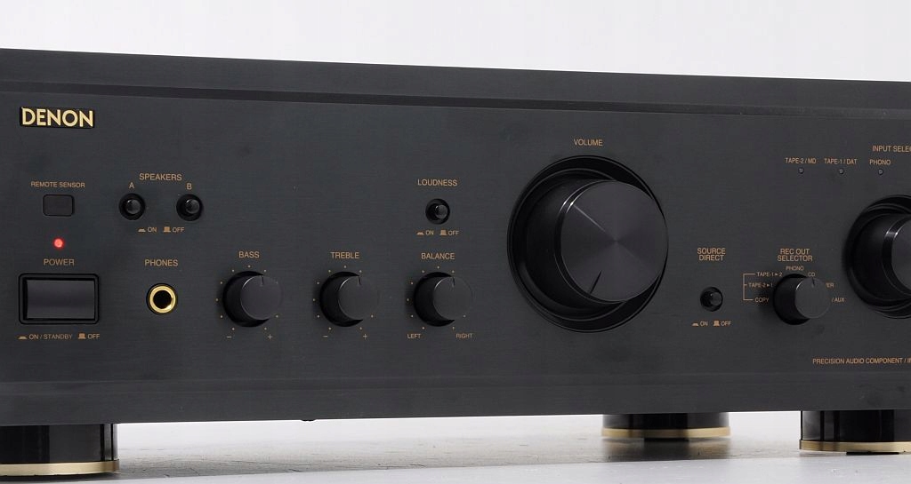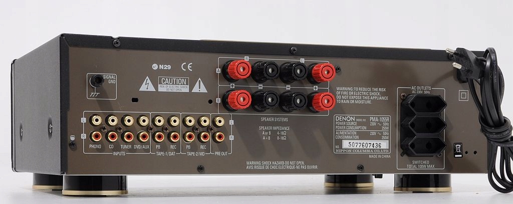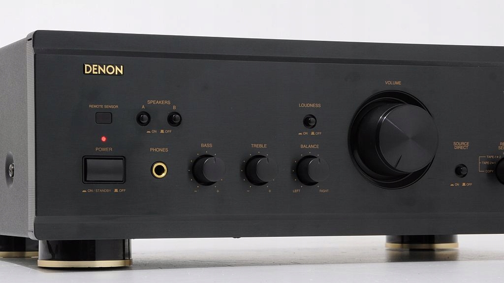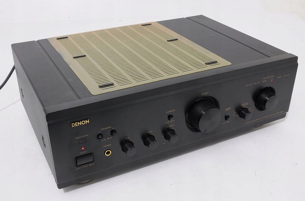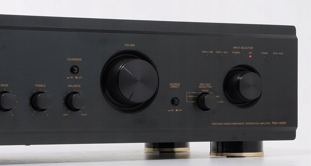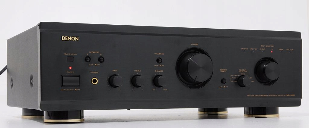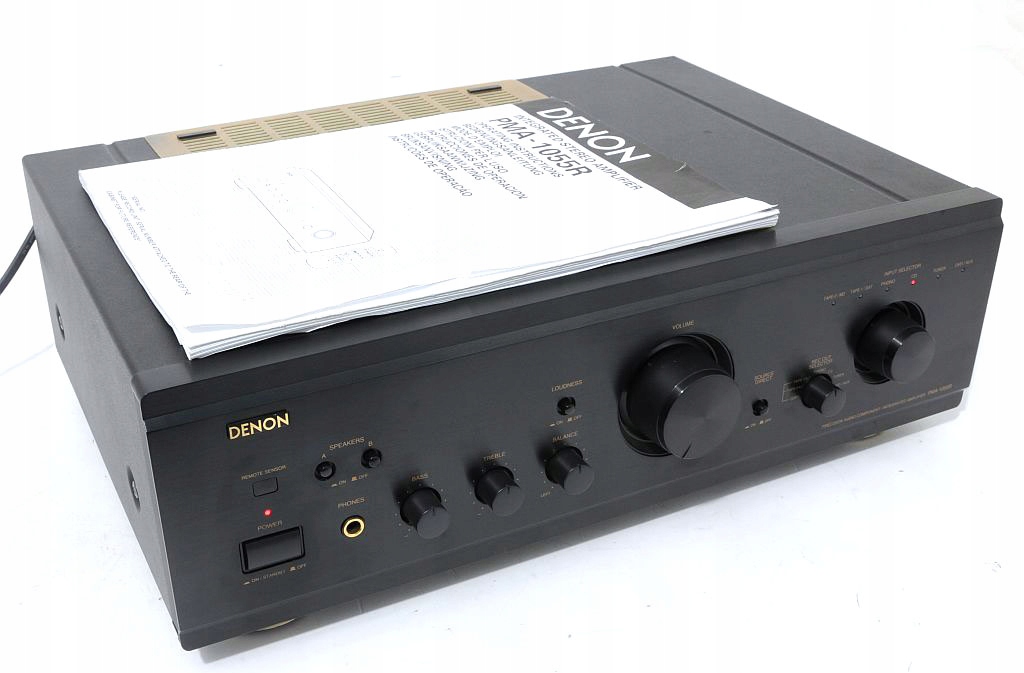 Model PMA-1055R jest urządzeniem z najnowszej generacji, skonstruowanym nie tylko z myślą o dokładnym odtwarzaniu muzyki z CD ale także z nowych formatach, czyli DVD-A i SACD. We wzmacniaczu znajdziemy szanowaną cechę konstrukcyjną sprawdzoną przez Denona w serii S1 – układ końcówki mocy na wysokoprądowych tranzystorach (HC) pracujących w układzie push-pull. Choć moc urządzenia jest całkiem pokaźna (120W/ kanał, 4Ohm) to liczy się przede wszystkim znaczna wydajność prądowa, do której zdolna jest końcówka mocy. Specjalne jest także wykonanie zasilacza. W oddzielnym sektorze, odseparowanym od elektroniki aluminiowym radiatorem, znajdują się dwa transformatory pracujące zgodnie z metodą LC (Leakage Cancelling). Sposób polega na takim dobraniu parametrów transformatorów by emitowane przez nie na zewnątrz pasożytnicze promieniowania miały przeciwny kierunek strumienia magnetoelektrycznego. Wówczas niepożądane fale, mogące znacząco wpływać na pozostałe komponenty, po prostu się znoszą. Najważniejsze jednak, że dwa transformatory pozwalają na wydobycie z końcówek o wiele większego prądu niż przy użyciu jednego. Dodatkowe (równoległe) połączenie zasilacza z końcówkami wykonano za pośrednictwem diod Shottky’ego, które są doskonałym instrumentem do filtrowania najwyższych częstotliwości. Za pośrednictwem diod prąd przekazywany jest bezpośrednio do końcówek mocy, co nie tylko wydajnie zwiększa szybkość działania układu ale również powoduje, że poziom szumów staje się wręcz marginalny. Mikroprocesor zasilany jest z niezależnego transformatora. Układ sterujący jest zupełnie odłączany (opcja „stop”) gdy użytkownik nie wykonuje żadnych operacji, dzięki temu rośnie pewność, że nie wpływ tego komponentu na inne elementy elektroniczne praktycznie został wyeliminowany. Świadomość obecności na rynku SACD i DVD-A wymusiły na konstruktorach konieczność dopasowania swoich urządzeń do wymagań nowych standardów. Denon nie musiał się zbytnio wysilać – wystarczyło zadbanie o niższy poziom szumów (konieczny do otrzymania zadowalającej dynamiki) i rozszerzenie pasma przenoszenia końcówki mocy. PMA-1055R z pewnością jest pod tym względem bardzo nowoczesny. Wzmacniacz zaopatrzono aż w sześć liniowych wejść, towarzyszące im dwa wyjścia pozwalają na podłączenie kopiarek. PMA-1055R współpracuje również z wkładką MM analogowego gramofonu. Na tylnym panelu znajdują się trzy liniowe wyjścia, które wraz z funkcjami sterującymi jakie daje pilot, pozwalają na wygodną obsługę całego zestawu Denona.PMA-1055R został wykonany w sposób bardzo solidny, szczególnie imponująca jest grubość aluminiowej płyty przedniej.
