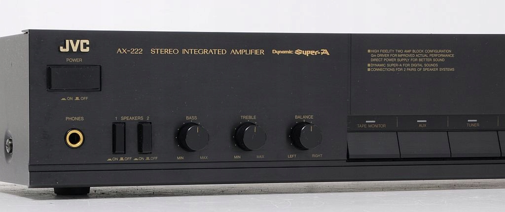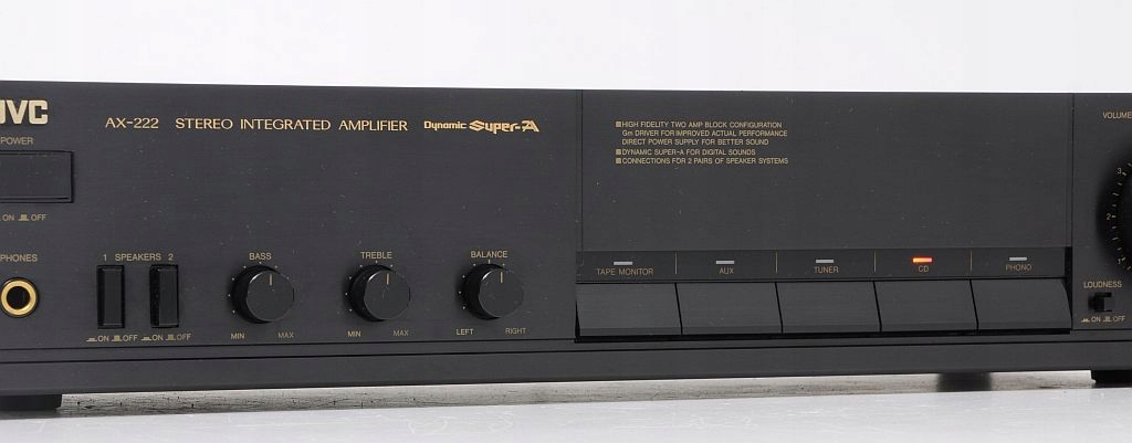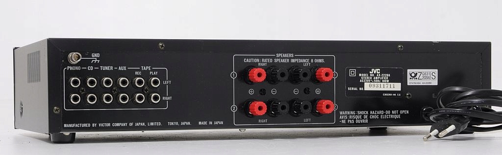 Oferowany model wzmacniacza stereo jest raczej nietuzinkowym urządzeniem w świecie fanatyków dobrego brzmienia. Firma JVC to super liga w tamtych latach ,specjalizującą się w sprzęcie elektronicznym z wyższego pułapu cenowego i filozofią tej firmy zawsze było aby dobry dźwięk był na pierwszym miejscu. Urządzenie jest solidne i piękne, mające wszystkie zalety funkcjonalności a jednocześnie wygody użytkownika. Wielkie doświadczenie inżynierów przyniosło efekt w postaci brzmienia bardzo kulturalnego, zrównoważonego i uporządkowanego które można by umieścić jako wzór podejścia do sfery dźwięku. Średnica jest wypełniona a bas obszerny w ogóle słuchając tego wzmacniacza nie stoi się z boku tylko obcuję z muzyką. Na pewno nic w tym wzmacniaczu nas przykro nie zaskoczy nie ma tutaj jazgoczącej góry czy dudniącego basu. Naturalność przekazu jest priorytetem nie podlegającym żadnej dyskusji.