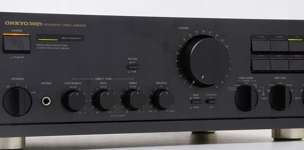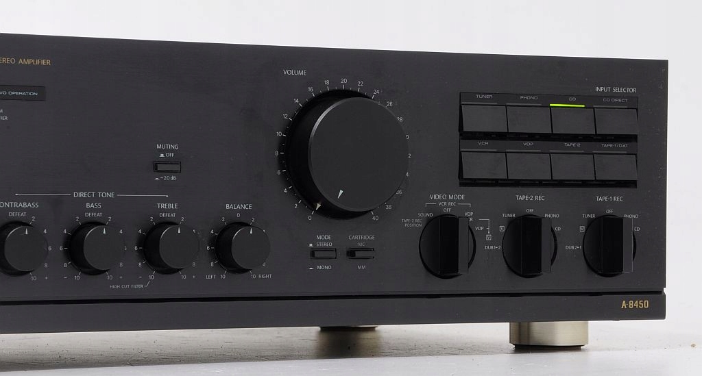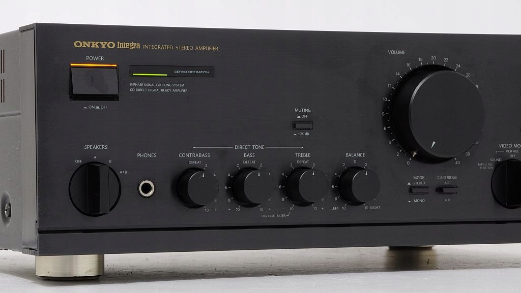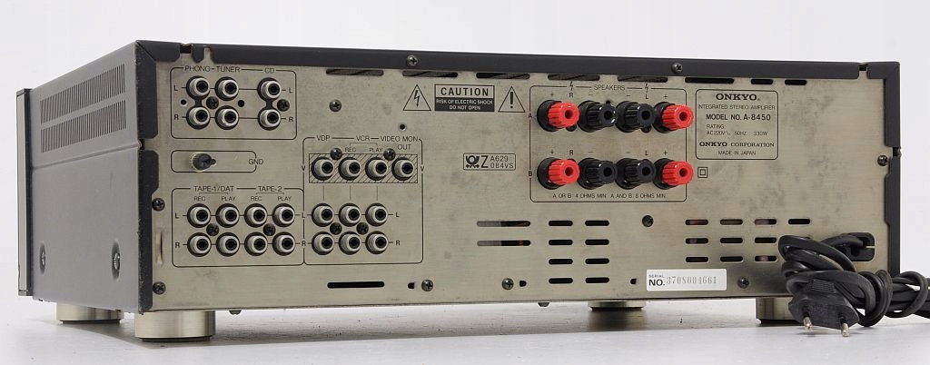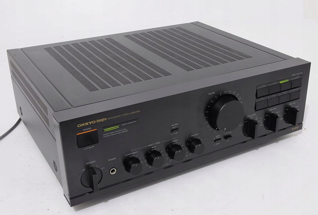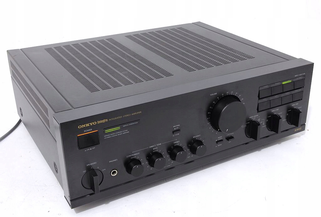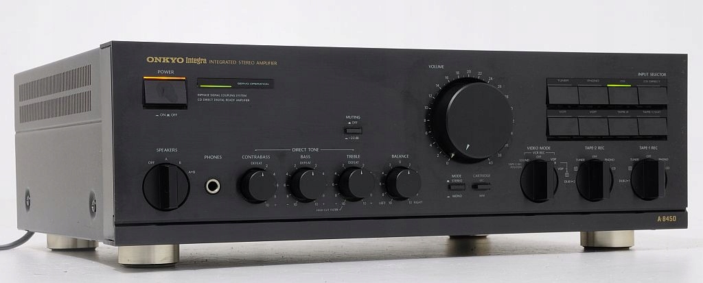 Najwyższej klasy referencyjny wzmacniacz Onkyo Integra A-8450. Pierwsze, co rzuca się w oczy - perfekcja wykonania - komponenty dobrane precyzyjnie, wszystko wykonane z istnie pedantyczną dbałością o szczegóły, co potwierdzają opinie jego użytkowników na tematycznych forach internetowych. Jest to sprzęt wyprodukowany w Japonii, co samo w sobie dobrze świadczy o urządzeniu. Dowodem na solidne wykonanie jest chociażby jego niebagatelna waga - ok. 12,5 kg(!). Model ten jest jednym z flagowych (wysokobudżetowych) konstrukcji. Audiofilskie wykonanie, końcówki mocy to uznawane jedne z najlepszych na świecie. Potencjometry ALPS, ogromne trafo! Wygląd zewnętrzny - onieśmielający - czystość formy, prostota i klasyka wykończenia. Tyle na temat wyglądu i wykonania, które są przedsmakiem do jego brzmienia. Wzmacniacz posiada bardzo przydatną funkcję CD DIRECT - dźwięk płynie prosto ze źródła do końcówek mocy - zero zbędnych filtrów, potencjometrów, a co za tym idzie nieuniknionych zniekształceń - jakość dźwięku z CD oszołamiająca. Przedwzmacniacz posiada standardowe regulatory - głośność, tony niskie, wysokie, funkcję wyciszania -20dB, przełącznik trybu mono/stereo. Sprzęt posiada przedwzmacniacz gramofonowy współpracujący z wkładkami MM i MC. Dodatkową niespotykaną funkcją jest dodatkowa regulacja basu CONTRABAS. Każde kolumny zagrają jak nigdy wcześniej...