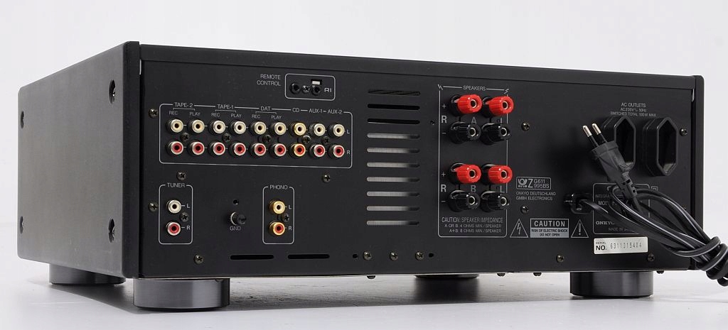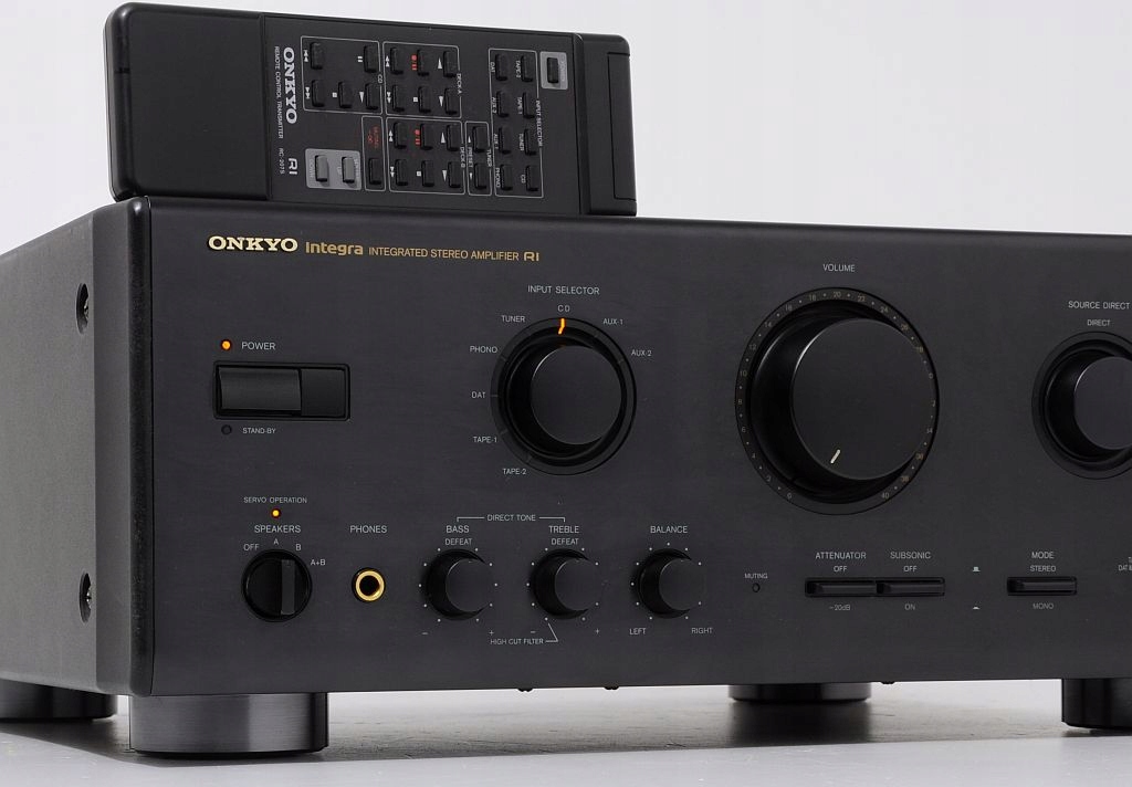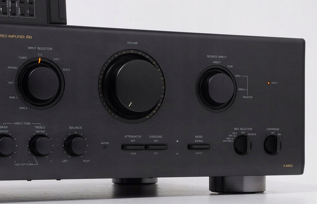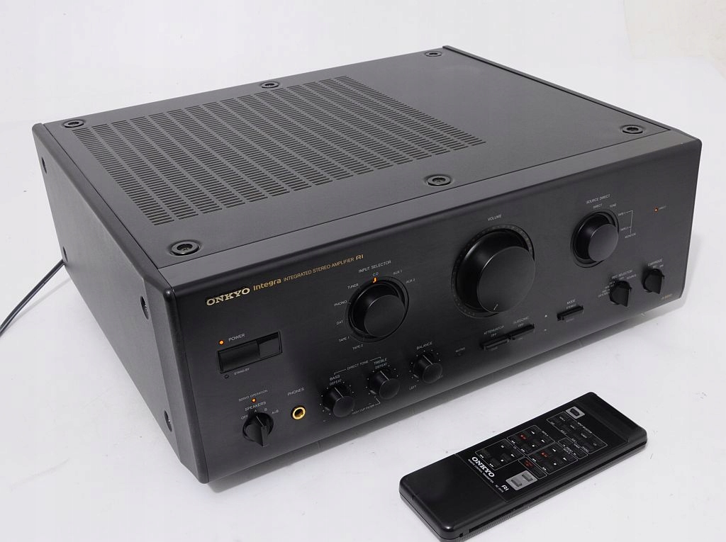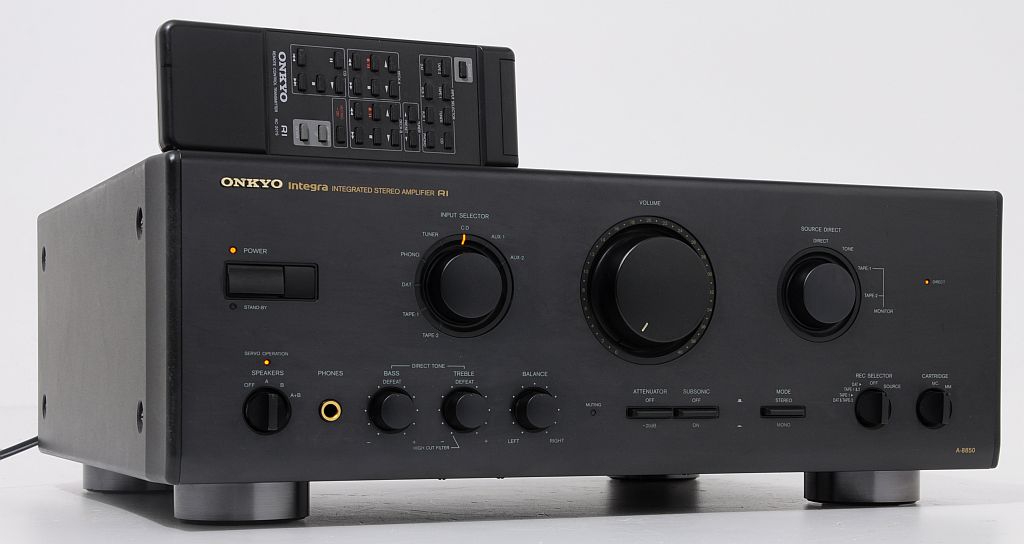 Najwyższej klasy referencyjny wzmacniacz Onkyo Integra A-8850. Pierwsze, co rzuca się w oczy - perfekcja wykonania - komponenty dobrane precyzyjnie, wszystko wykonane z istnie pedantyczną dbałością o szczegóły, co potwierdzają opinie jego użytkowników na tematycznych forach internetowych. Jest to sprzęt wyprodukowany w Japonii, co samo w sobie dobrze świadczy o urządzeniu. Dowodem na solidne wykonanie jest chociażby jego niebagatelna waga - ok. 15 kg(!). Model ten jest jednym z flagowych (wysokobudżetowych) konstrukcji. Audiofilskie wykonanie ,wszystkie kondensatory NICHICON a w przedwzmacniaczu (audiofilskie) NICHICON MUSE, końcówki mocy to uznawane za najlepsze na świecie tranzystory japońskiej firmy SANKEN. Potencjometry ALPS, ogromne trafo! Wygląd zewnętrzny - onieśmielający - czystość formy, prostota i klasyka wykończenia. Tyle na temat wyglądu i wykonania, które są przedsmakiem do jego brzmienia. Wzmacniacz posiada bardzo przydatną funkcję SOURCE DIRECT - dźwięk płynie prosto ze źródła do końcówek mocy - zero zbędnych filtrów, potencjometrów, a co za tym idzie nieuniknionych zniekształceń - jakość dźwięku z CD oszołamiająca. Przedwzmacniacz posiada standardowe regulatory - głośność, tony niskie, wysokie, funkcję wyciszania -20dB, przełącznik trybu mono/stereo, filtr subsoniczny. Sprzęt posiada przedwzmacniacz gramofonowy współpracujący z wkładkami MM i MC. Wyboru źródła dokonujemy za pomocą cyfrowego przełącznika, wykonanego na elektromagnesach - zapobiega to powstawaniu przesłuchów między źródłami.