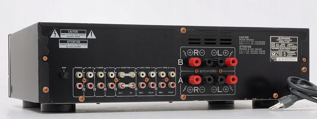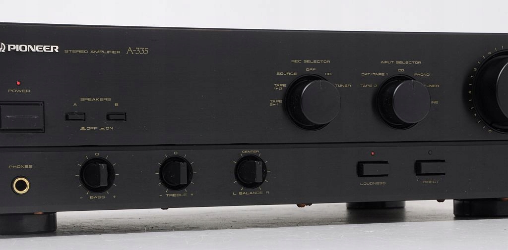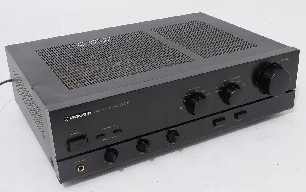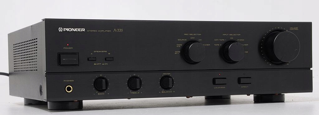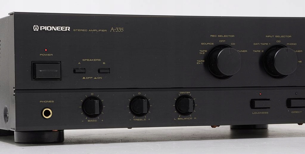Oferowane urządzenie to znany z półek sklepowych Pioneer A-335 to tzw. średnia klasa budżetowa, łącząca w sobie doskonałe parametry i solidność wykonania. Budowa wzmacniacza – oparta na tranzystorach: 4xToshiba, kondensatorach ELNA, potencjometrach ALPS, całość zasilana solidnym transformatorem (Bando). Oferowany A-335 pochodzi z macierzystych zakładów w Japonii, czołówka wykonana z aluminium. Wzmacniacz nie był katowany, nie ma za sobą ciężkich przeżyć co z pewnością przyszły nabywca usłyszy i zobaczy. Zachęcam do zakupu, maszyna pochodzi z ostatniej porządnej linii, ogólnie wiadomo - „kanciaki” najlepsze (nie tylko w przypadku marki Pioneer:)