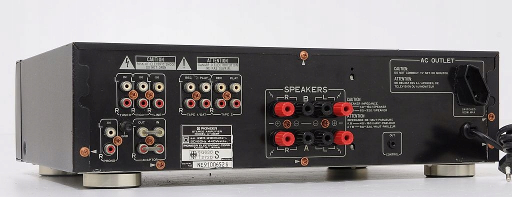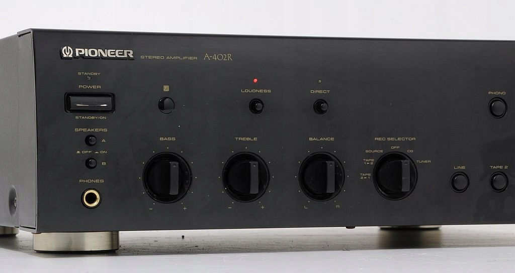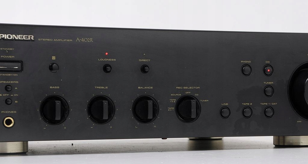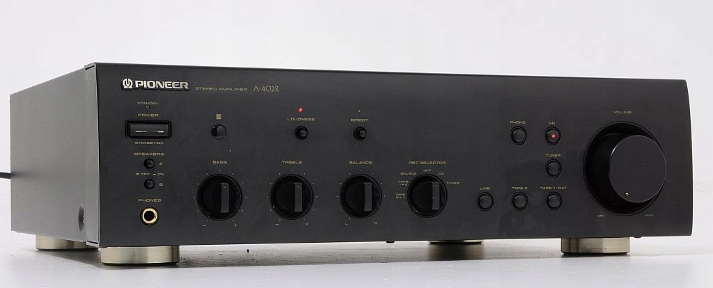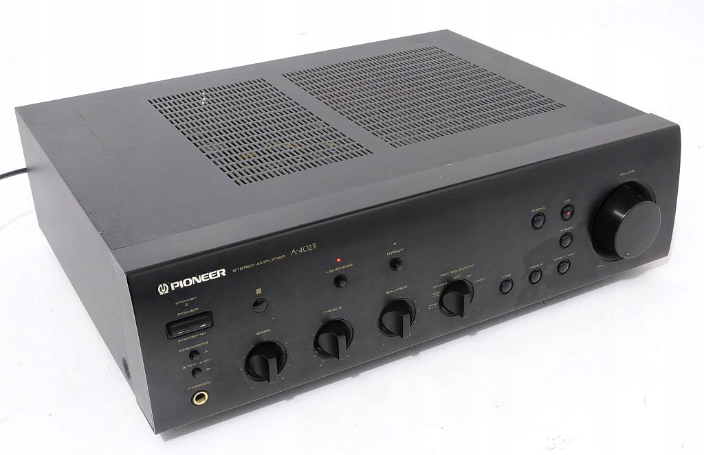 Przedmiotem aukcji jest wysokiej klasy wzmacniacz znanej i cenionej firmy Pioneer. Już na pierwszy rzut oka widać, ze sprzęt jest solidnie zbudowany i posiada przyjemny dla oka design. Jeszcze bardziej zaskakuje wnętrze... We wzmacniaczu zastosowano duże trafo i solidne kondensatory filtrujące. Wzmacniacz dysponuje mocą 2 x 80 W , przy czym warto dodać, że jest "prawdziwa" moc, a nie wyssana z palca moc muzyczna. Po podłączeniu i chwili odsłuchu, okazuje się, że parametry rzeczywiście znajdują przełożenie w tym, co wydobywa się z kolumn. Dźwięk jest bogaty, szczegółowy i dynamiczny. U Pioneera nigdy nie brakowało głębokiego i dobrze kontrolowanego bassu. Na panelu zainstalowano potencjometry (BASS, TREBLE) więc barwę można dostosować do upodobań. Dodatkowe podbicie Loudness znajdzie zastosowanie przy kolumnach z dobrymi głośnikami basowymi, a w razie potrzeby funkcja Direct pozwoli ominąć sekcję korektora. Wzmacniacz bardzo dobrze wyposażony - możliwość jednoczesnego podłączenia aż 6 urządzeń wejściowych. Podsumowując, Pioneer A-402R to model z nowszej linii Pioneera i zarazem jedna z najlepszych propozycji w tym przedziale cenowym. Będzie doskonałą podstawą dobrego systemu HiFi.