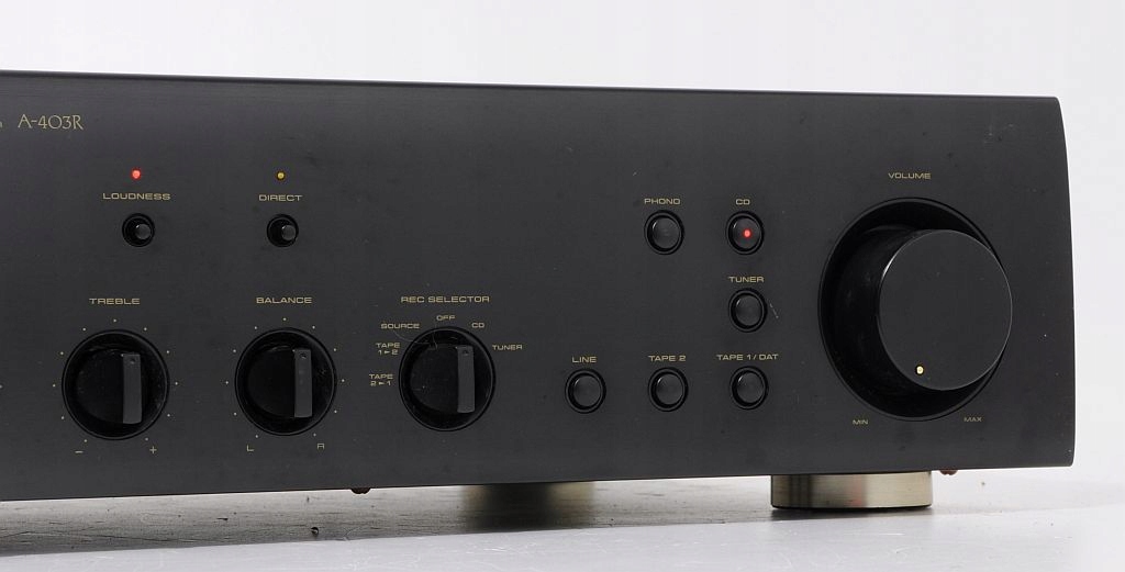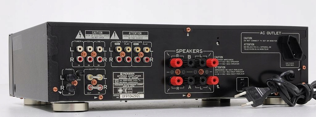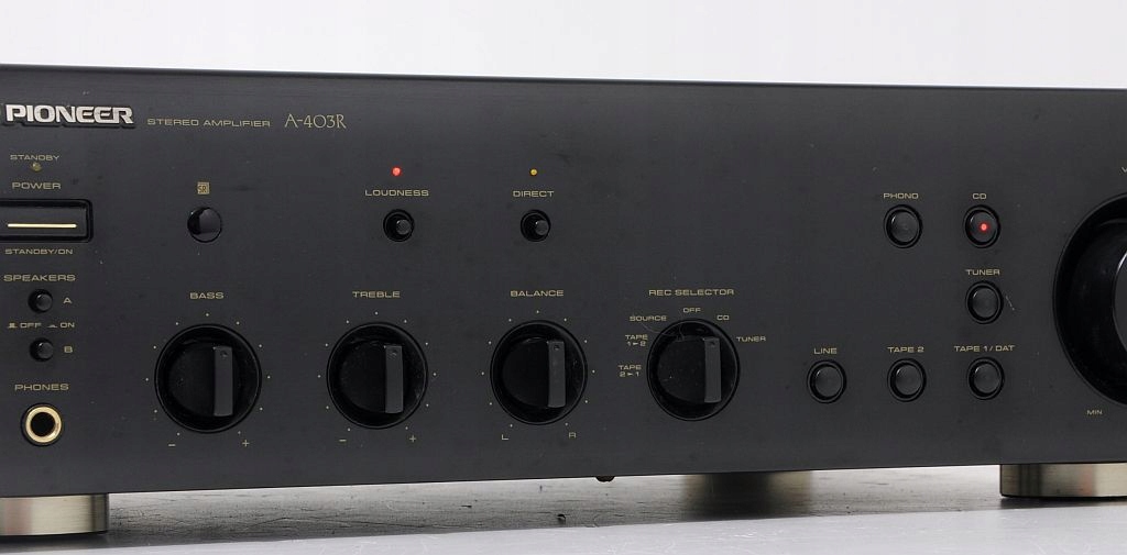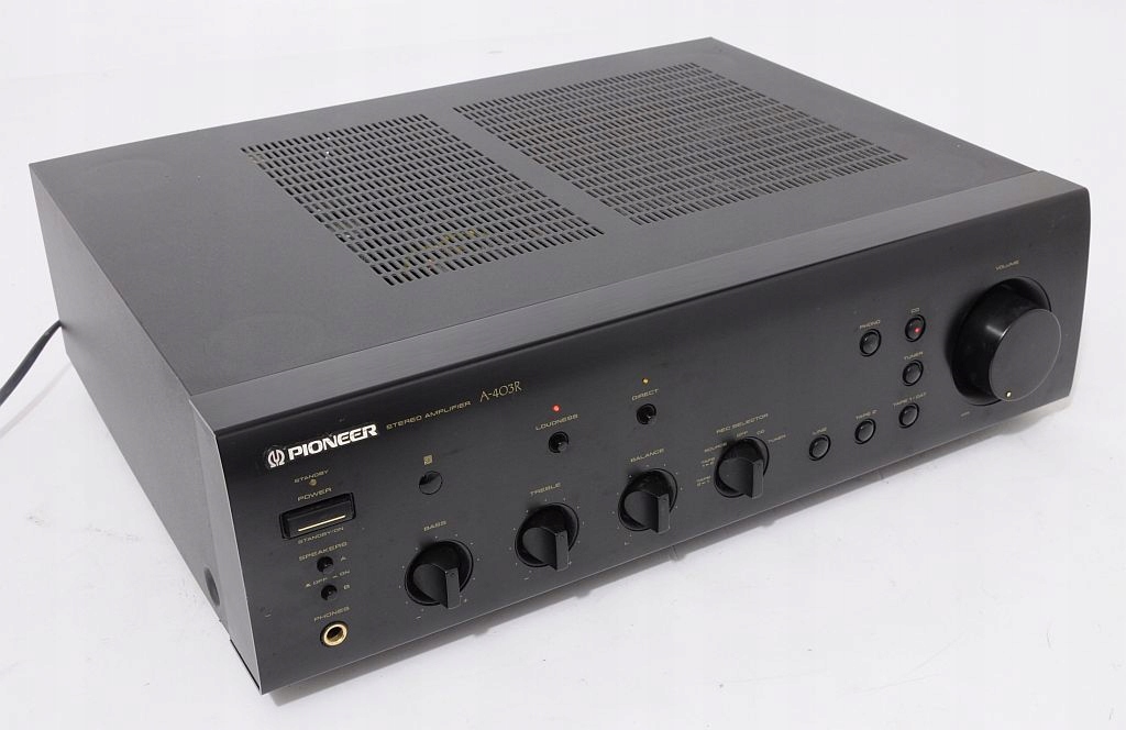 Przedmiotem aukcji jest wysokiej klasy wzmacniacz znanej i cenionej firmy Pioneer. Już na pierwszy rzut oka widać, ze sprzęt jest solidnie zbudowany i posiada przyjemny dla oka design. Jeszcze bardziej zaskakuje wnętrze... We wzmacniaczu zastosowano duże trafo i solidne kondensatory filtrujące. Wzmacniacz dysponuje mocą 2 x 80 W , przy czym warto dodać, że jest "prawdziwa" moc, a nie wyssana z palca moc muzyczna. Po podłączeniu i chwili odsłuchu, okazuje się, że parametry rzeczywiście znajdują przełożenie w tym, co wydobywa się z kolumn. Dźwięk jest bogaty, szczegółowy i dynamiczny. U Pioneera nigdy nie brakowało głębokiego i dobrze kontrolowanego bassu. Na panelu zainstalowano potencjometry (BASS, TREBLE) więc barwę można dostosować do upodobań. Dodatkowe podbicie Loudness znajdzie zastosowanie przy kolumnach z dobrymi głośnikami basowymi, a w razie potrzeby funkcja Direct pozwoli ominąć sekcję korektora. Wzmacniacz bardzo dobrze wyposażony - możliwość jednoczesnego podłączenia aż 6 urządzeń wejściowych. Podsumowując, Pioneer A-403R to model z nowszej linii Pioneera i zarazem jedna z najlepszych propozycji w tym przedziale cenowym. Będzie doskonałą podstawą dobrego systemu HiFi.