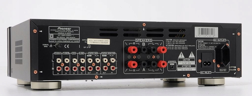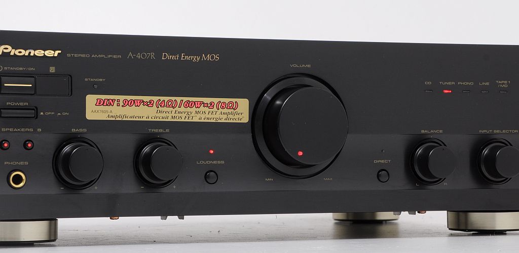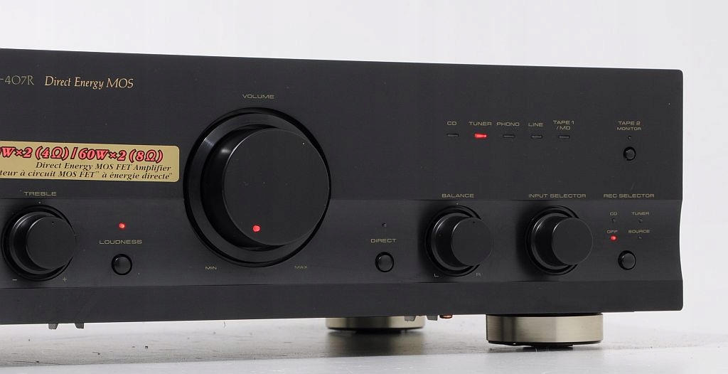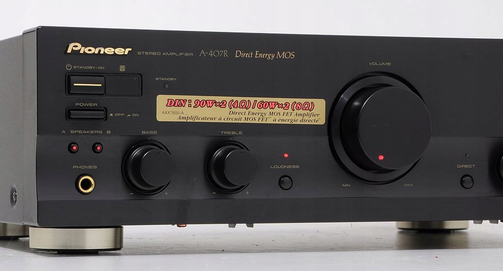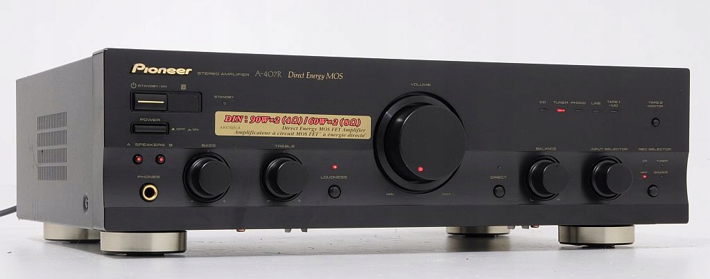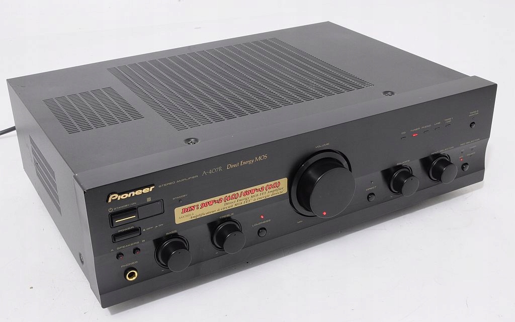 Przedmiotem aukcji jest wysokiej klasy wzmacniacz znanej i cenionej firmy Pioneer. Już na pierwszy rzut oka widać, ze sprzęt jest solidnie zbudowany i posiada przyjemny dla oka design. Jeszcze bardziej zaskakuje wnętrze... We wzmacniaczu zastosowano duże trafo i 2 znakomite kondensatory filtrujące. Wzmacniacz dysponuje mocą 2 x 60 W / 8 Ohm, przy czym warto dodać, że jest "prawdziwa" moc, a nie wyssana z palca. Po podłączeniu i chwili odsłuchu, okazuje się, że parametry rzeczywiście znajdują przełożenie w tym, co wydobywa się z kolumn. Dźwięk jest bogaty, szczegółowy i dynamiczny. U Pioneera nigdy nie brakowało głębokiego i dobrze kontrolowanego bassu. Na panelu zainstalowano potencjometry (BASS, TREBLE) więc barwę można dostosować do upodobań. Dodatkowe podbicie Loudness znajdzie zastosowanie przy kolumnach z dobrymi głośnikami bassowymi, a w razie potrzeby funkcja Direct pozwoli ominąć sekcję korektora. Wzmacniacz bardzo dobrze wyposażony - możliwość jednoczesnego podłączenia aż 6 urządzeń wejściowych. Podsumowując, Pioneer A-407R to model z nowszej linii Pioneera i zarazem jedna z najlepszych propozycji w tym przedziale cenowym. Będzie doskonałą podstawą dobrego systemu HiFi.