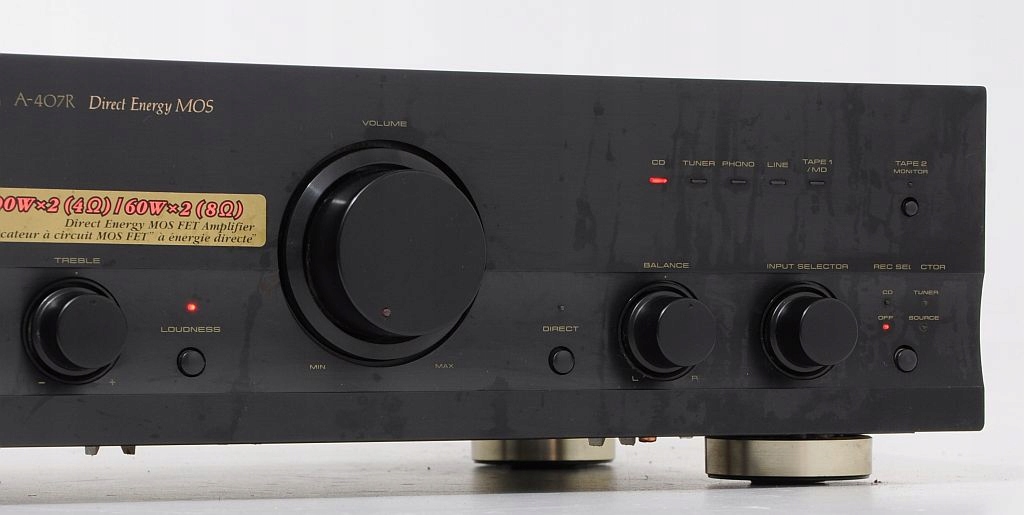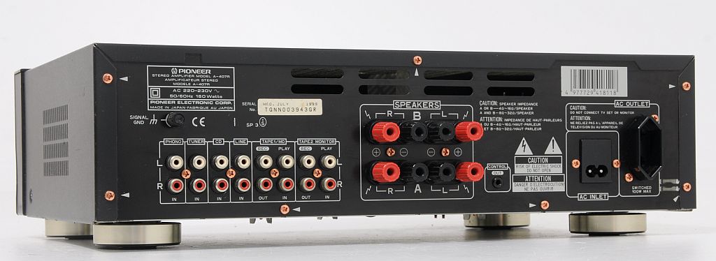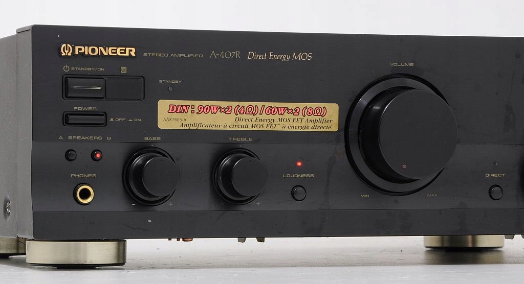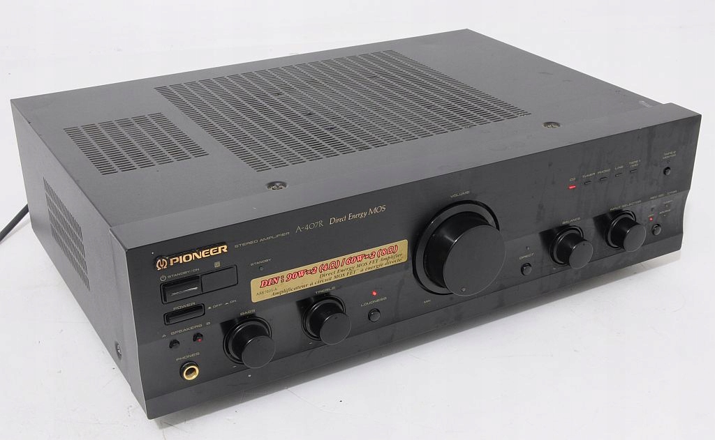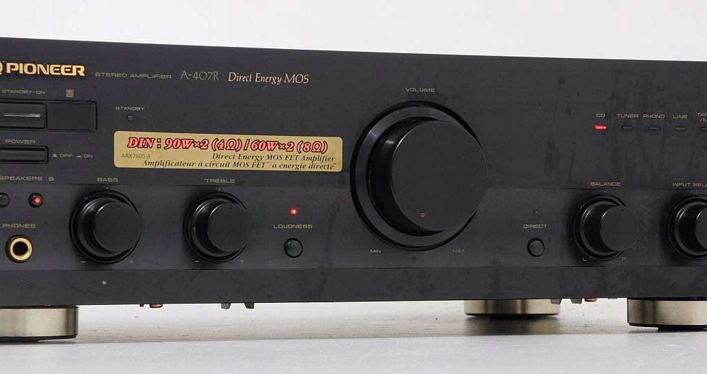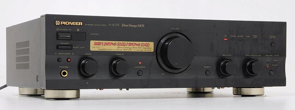 Przedmiotem aukcji jest wysokiej klasy wzmacniacz znanej i cenionej firmy Pioneer. Już na pierwszy rzut oka widać, ze sprzęt jest solidnie zbudowany i posiada przyjemny dla oka design. Jeszcze bardziej zaskakuje wnętrze... We wzmacniaczu zastosowano duże trafo i 2 znakomite kondensatory filtrujące. Wzmacniacz dysponuje mocą 2 x 60 W / 8 Ohm, przy czym warto dodać, że jest "prawdziwa" moc, a nie wyssana z palca. Po podłączeniu i chwili odsłuchu, okazuje się, że parametry rzeczywiście znajdują przełożenie w tym, co wydobywa się z kolumn. Dźwięk jest bogaty, szczegółowy i dynamiczny. U Pioneera nigdy nie brakowało głębokiego i dobrze kontrolowanego bassu. Na panelu zainstalowano potencjometry (BASS, TREBLE) więc barwę można dostosować do upodobań. Dodatkowe podbicie Loudness znajdzie zastosowanie przy kolumnach z dobrymi głośnikami bassowymi, a w razie potrzeby funkcja Direct pozwoli ominąć sekcję korektora. Wzmacniacz bardzo dobrze wyposażony - możliwość jednoczesnego podłączenia aż 6 urządzeń wejściowych. Podsumowując, Pioneer A-407R to model z nowszej linii Pioneera i zarazem jedna z najlepszych propozycji w tym przedziale cenowym. Będzie doskonałą podstawą dobrego systemu HiFi.