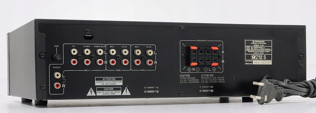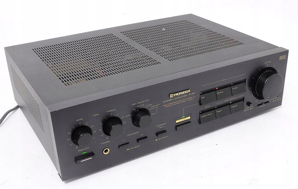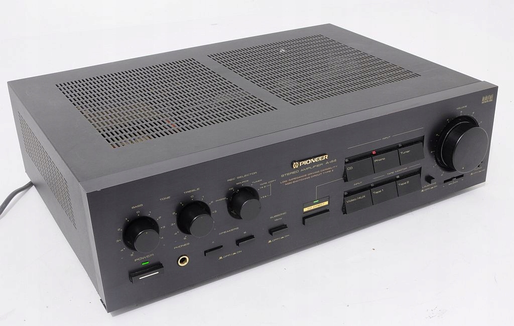 Oferowane urządzenie to znany z dawnych półek sklepowych Pioneer A-44 to tzw. średnia klasa budżetowa, łącząca w sobie doskonałe parametry i solidność wykonania. Budowa wzmacniacza – oparta na tranzystorach, kondensatorach ELNA, potencjometrach ALPS, całość zasilana solidnym transformatorem (Bando). Oferowany A-44 pochodzi z macierzystych zakładów w Japonii, czołówka wykonana z aluminium. Wzmacniacz nie był katowany, nie ma za sobą ciężkich przeżyć co z pewnością przyszły nabywca usłyszy i zobaczy. Zachęcam do zakupu, maszyna pochodzi z porządnej linii, ogólnie wiadomo - „kanciaki” najlepsze (nie tylko w przypadku marki Pioneer:)