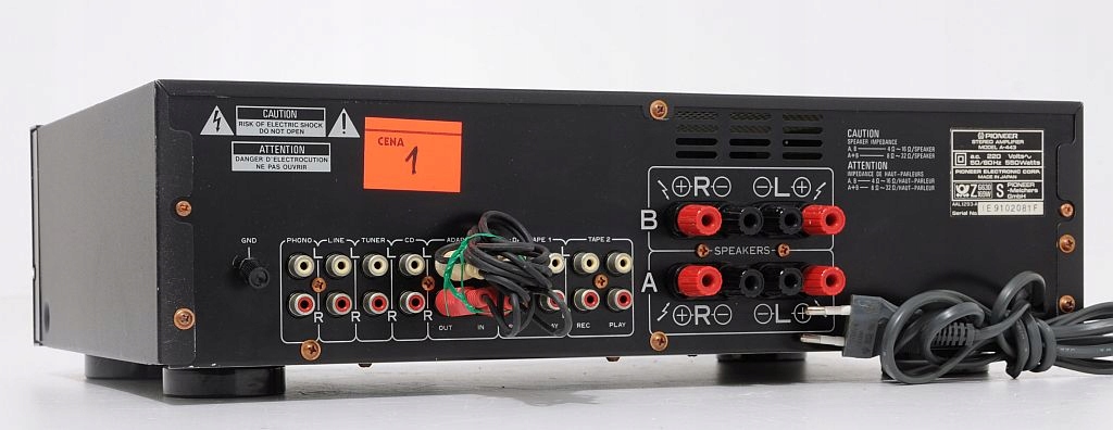 Oferowane urządzenie to znany z dawnych półek sklepowych Pioneer A-44 to tzw. średnia klasa budżetowa, łącząca w sobie doskonałe parametry i solidność wykonania. Budowa wzmacniacza – oparta na tranzystorach, kondensatorach ELNA, potencjometrach ALPS, całość zasilana solidnym transformatorem (Bando).  Oferowany A-44 pochodzi z macierzystych zakładów w Japonii, czołówka wykonana z aluminium. Wzmacniacz nie był katowany, nie ma za sobą ciężkich przeżyć co z pewnością przyszły nabywca usłyszy i zobaczy. Zachęcam do zakupu, maszyna pochodzi z  porządnej linii, ogólnie wiadomo - „kanciaki” najlepsze (nie tylko w przypadku marki Pioneer:)