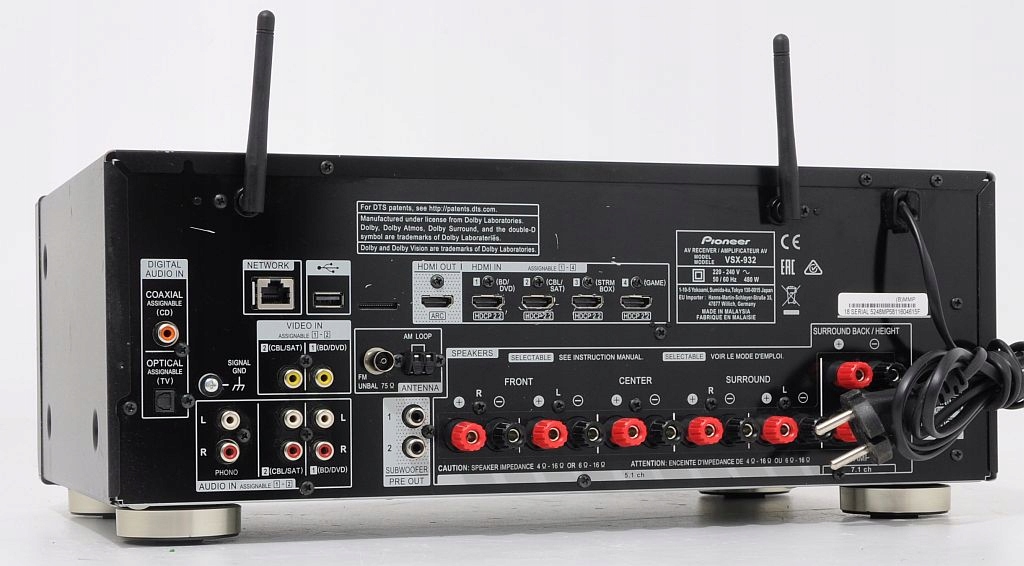 O tym, że VSX-932 jest sprzętem typowo kinowym świadczy nie tylko czysta 7 kanałowa sekcja audio, która realizuje wyłącznie funkcje kinowe w pierwszej strefie (w tym Dolby Atmos i DTS:X). Nowy amplituner Pioneera posiada wszystkie najnowsze układy dekodujące obraz w najwyższej jakości reżyserskiej, czyli HDR10 oraz rozszerzone HDR10 Dolby Vision. W przypadku ostatniego kodowania realizator obrazu filmowego może korygować oświetlenie i kolory dosłownie, w każdej klatce obrazu. Amplituner dysponuje słuszną mocą 85W przy 8 ohmach i 130W przy 6 ohmach i bez problemu obsługuje kolumny w zakresie od 4 do 16 ohmów. Aby dźwięk kinowy był najwyższej próby Pioneer skupił się na rozwinięciu sekcji DSP opartej o czterordzeniowy procesor Cirrus Logic. Efekt to 12 zaawansowanych trybów odsłuchowych. Więcej niż w jakimkolwiek innym amplitunerze w tym segmencie cenowym.Naturalnie VSX-932 oferuje najważniejsze funkcje sieciowe, włączając Wi-Fi oraz Bluetooth służące do przesyłania plików stratnych oraz bezstratnych, a nawet DSD (w tym ostatnim wypadku wyłącznie po łączu ethernet).