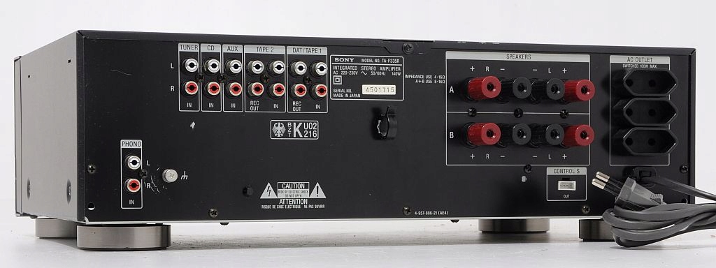 Przedstawiciel ostatniej porządnej linii Sony, potem nastała „era” plastików i układów STK… Oferowane urządzenie oferuje klasyczna konstrukcję opartą na solidnym transformatorze, końcówka mocy na tranzystorach załączana przekaźnikiem, kondensatory o słusznej pojemności, potencjometry Alps, to musi grać, to musi być niezawodne – i tak też jest w tym wypadku, urządzenie w 100% sprawne, bez napraw, na oryginalnych podzespołach. Uniwersalny design pozwala dokompletować „klocki” z szerokiego zakresu produktów wypuszczanych przez Sony na przekroju wielu lat. Urządzenie zostało wyprodukowane w macierzystych zakładach w Japonii, czołówka wykonana oczywiście z aluminium.