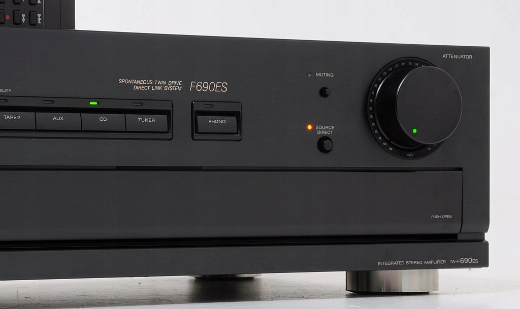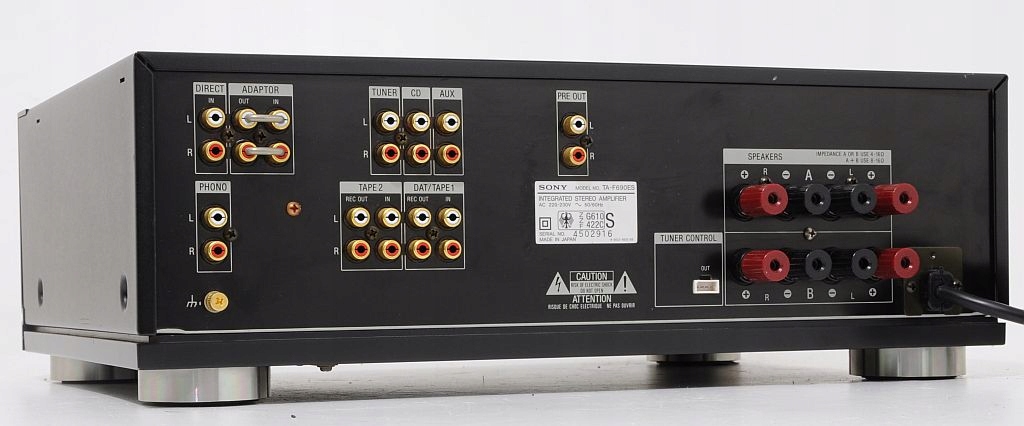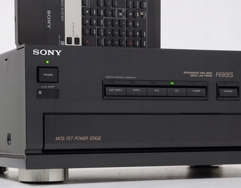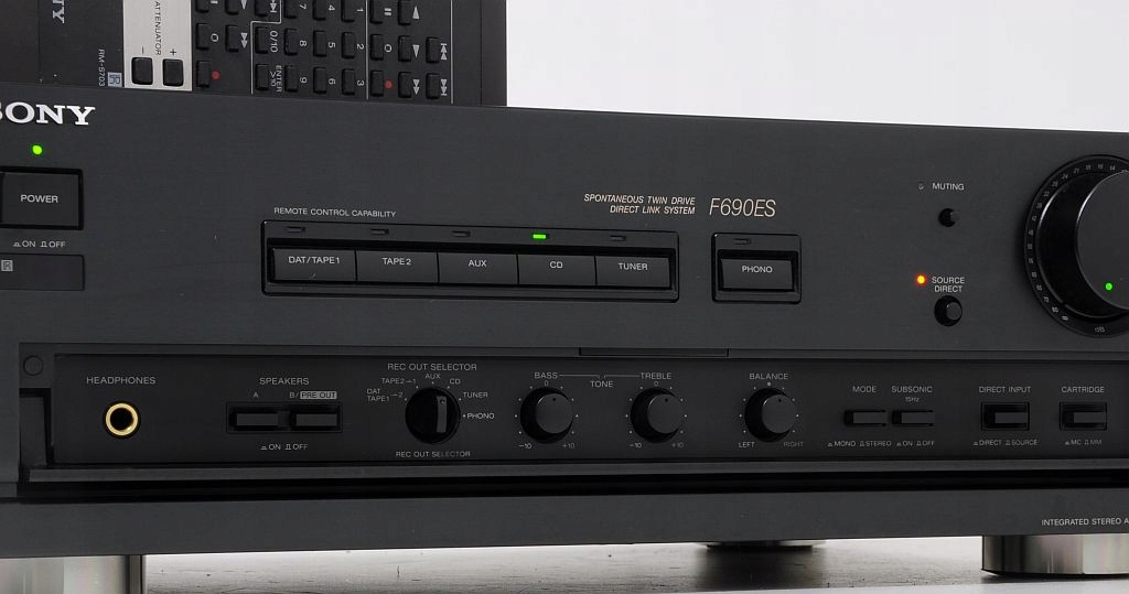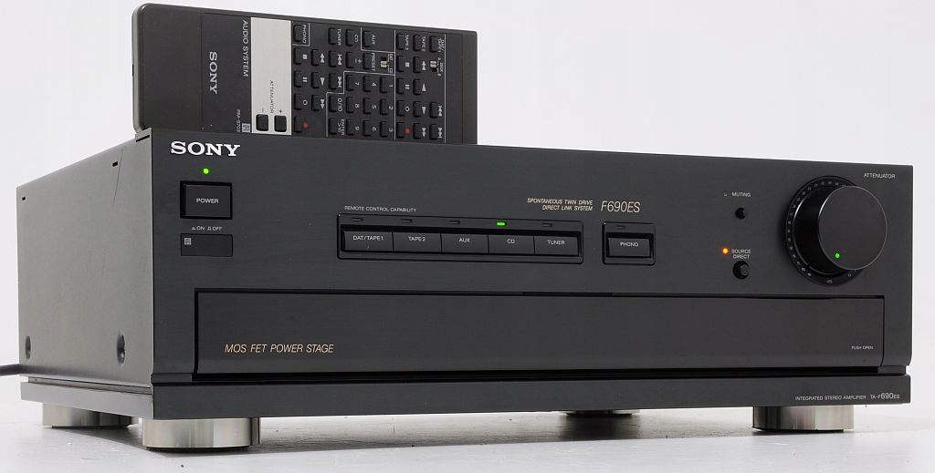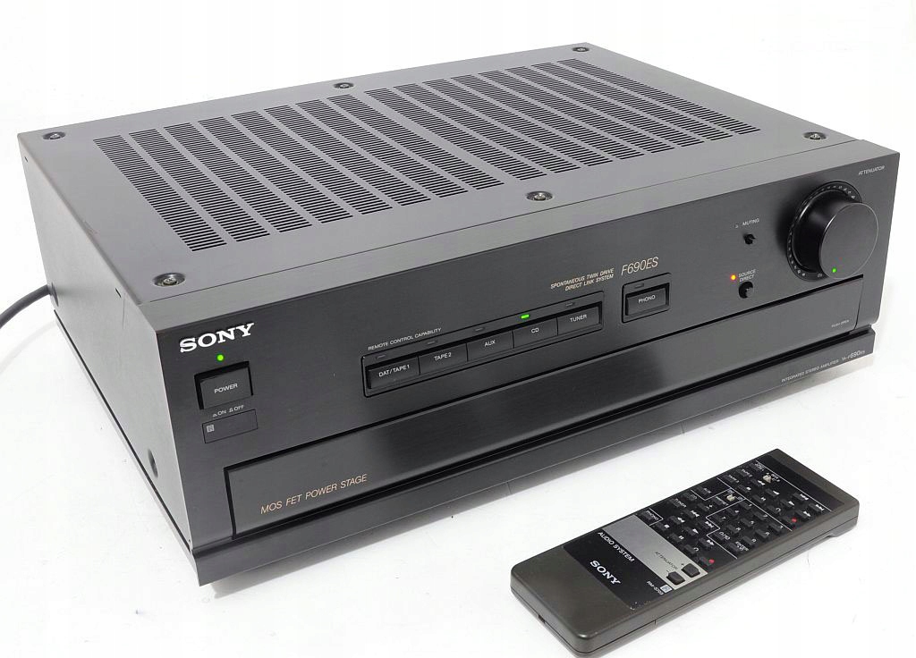 Seria wzmacniaczy klasy ES skierowana jest w myśl założeń firmy SONY do najbardziej wymagającej grupy klientów. Można powiedzieć z czystym sumieniem, że oferowana na tej aukcji pięćset siedemdziesiątka to doskonała, solidna konstrukcja z pierwszej dekady lat 90, przewyższająca zdecydowanie pod względem wykonania jak i parametrów technicznych wszystkie niższe modele, oraz większość współczesnych wzmacniaczy w cenie do 2500zł. Jeżeli ktoś lubi charakter brzmienia SONY to będzie z pewnością bardzo zadowolony. Na wyposażeniu posiada bardzo wysokiej jakości – toroidalny (firmowany: Sony ES) transformator, 4 kondensatory filtrujące ELNA 4 X 12000uF ORAZ 2X 5600uF na 63V, końcówka mocy oparta na 4 olbrzymich, prostokątnych tranzystorach SanKen typu MOS FET, przełączniki, potencjometry firmy Alps, pozłacane wszystkie wejścia/wyjścia RCA. Na przednim panelu pozostawione zostały jedynie funkcje: przycisk power, pokrętło głośności, selektory input/recout, funkcja mutting oraz direct, reszta przełączników, regulatorów została ukryta pod uchylną klapką ta podobnie ja przedni panel została wykonana z aluminium.