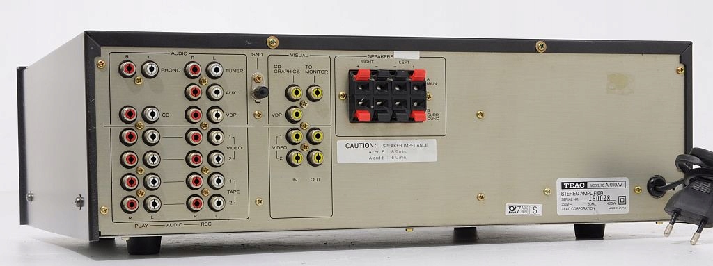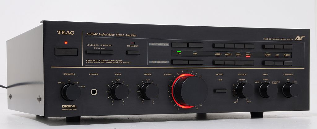 TEAC A-919AV to flagowy wzmacniacz zintegrowany audio-video z drugiej połowy lat 80., zaprojektowany w okresie, gdy japońscy producenci hi-fi stawiali na najwyższą jakość wykonania i dźwięku. To model, który łączy w sobie solidność konstrukcji, wysoką moc wyjściową i muzykalne brzmienie – cenione do dziś przez miłośników klasycznego sprzętu stereo.