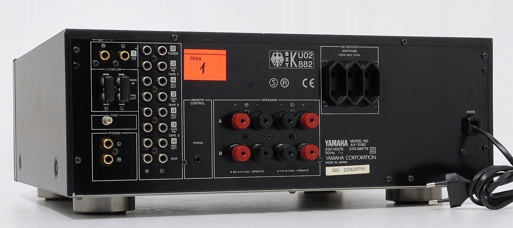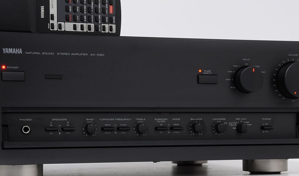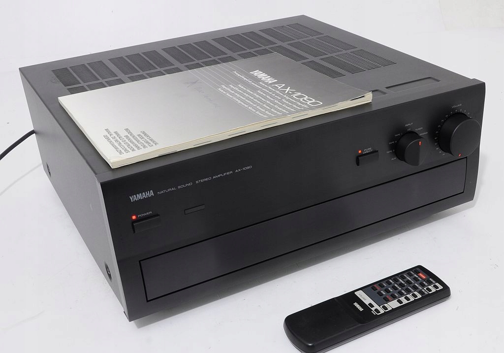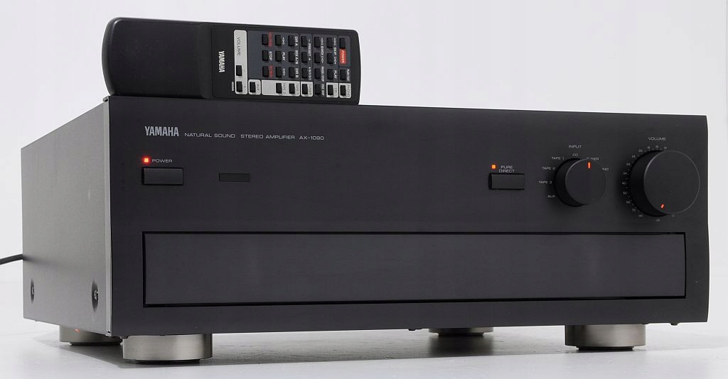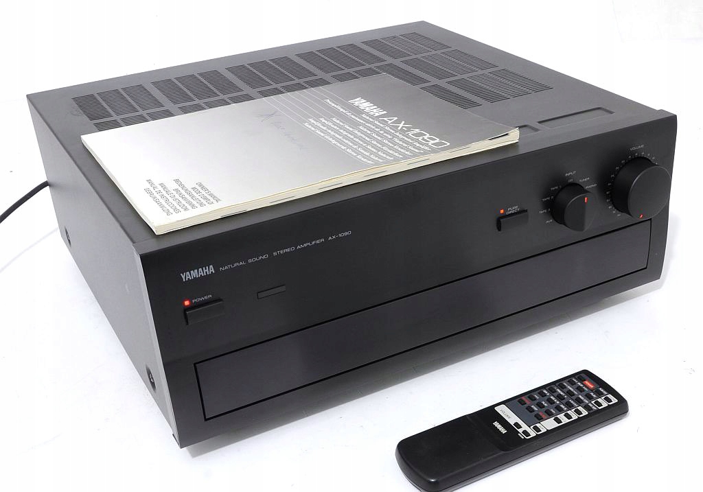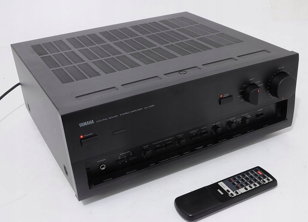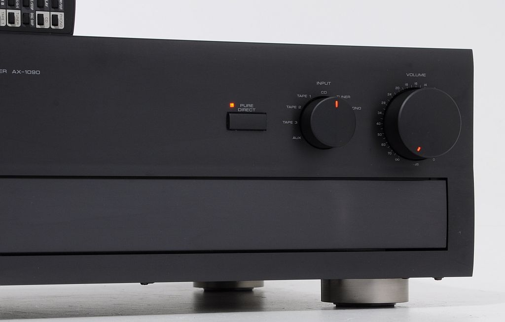 Mamy oczywiście bogate wyposażenie. Podłączyć można gramofon (obsługiwane są zarówno wkładki MM jak i MC), trzy źródła o poziomie liniowym i aż trzy magnetofony. AX-1090 ma też wyjście przedwzmacniacza i wejście wzmacniacza mocy. Normalnie są one zwarte załączoną zworą, ale możliwe jest korzystanie z każdej części osobno. Większość regulatorów i przełączników znajduje się za uchylną klapką, zawsze widoczne pozostają następujące elementy: włącznik sieciowy, przełącznik 'pure direct', przełącznik źródeł i regulacja głośności. AX-1090 ma dwa regulatory barwy, można nie tylko zmienić ilość niskich czy wysokich tonów, ale również wybrać częstotliwość, od której zaczyna działać filtr. Dla niskich tonów do wyboru są częstotliwości 200 i 400 Hz a dla wysokich 2,5 i 5 kHz. Regulowany jest też kontur. Oprócz tego wyposażenie dodatkowe uzupełniają selektory wyjść głośnikowych, wyjście słuchawkowe, regulator równowagi kanałów, wybór źródeł do nagrywania i zmiana czułości wejścia gramofonowego, filtr subsonic i przełącznik mono-stereo. Wzmacniacz ma też nadajnik zdalnego sterowania.