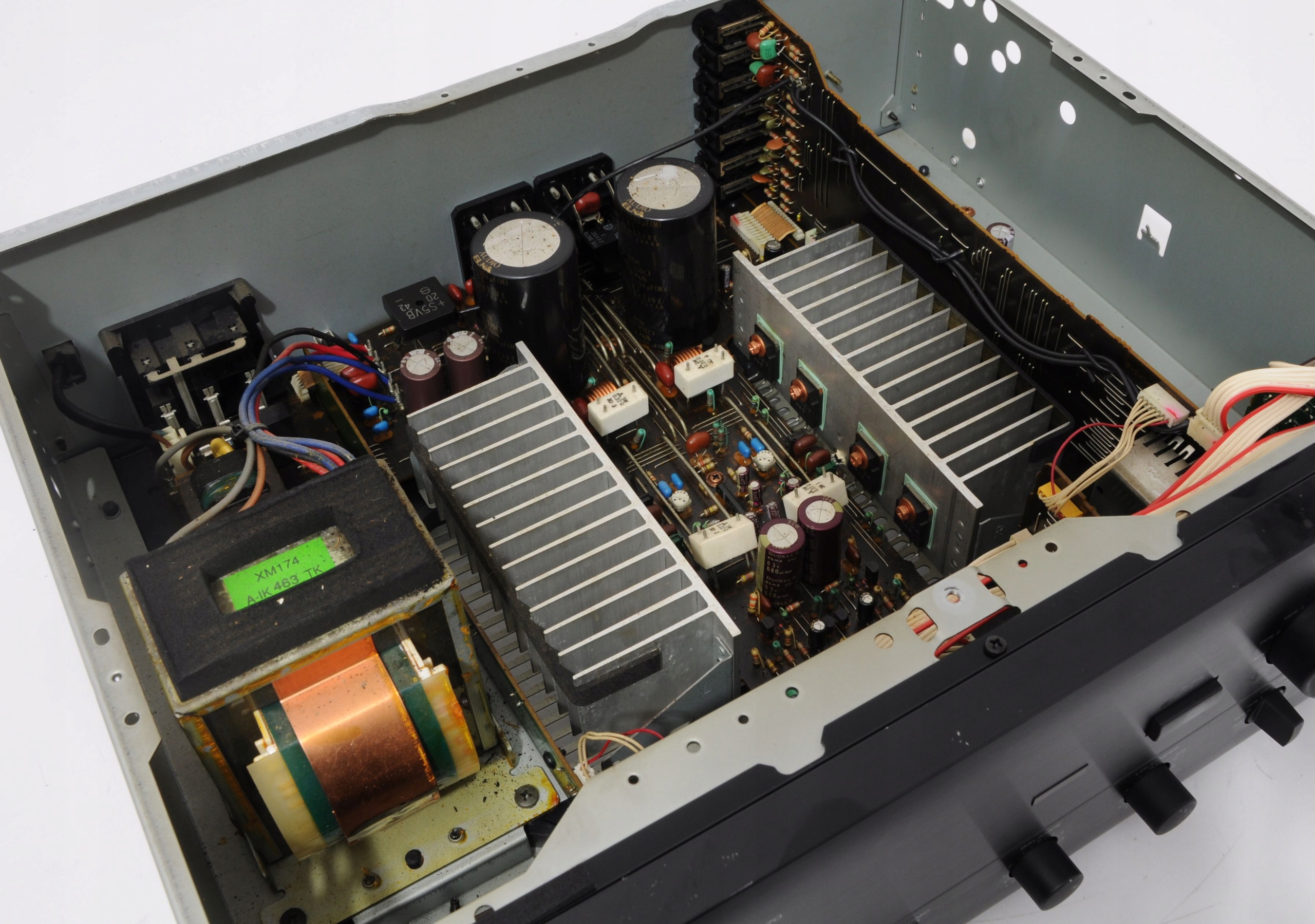 UWAGA ! Wzmacniacz włączył się ale podczas testów się wyłączył i jużnie chciał się odpalić. Co udało się ustalić jak jeszcze był włączony? Na pewno do czyszczenia przełącznik INPUT SELECTOR, ale to z drobnych rzeczy. Poważniejszą sprawą wydaję się być to, że lewy kanał i prawy kanał wydawał dźwięk tylko przy SOURDE DIRECT, przy czym lewy kanał grał jakby pełną mocą niezaleźnie od ustwienia Volume, prawy na potencjometr Volume reagował ale chyba grał za cicho jak na tą moc. Należy wspomnieć także o tym że cała płyta główna zalana jest jakimś tłustym preparatem więc cały środek nadaje się do gryntownego "kąpania". W razie wątpliwości sprawdzę na życzenie wszystko co będzie komuś potrzebne. Sprzedajemy w licytacji od 1zł jako USZKODZONY, bez gwarancji i możliwości zwrotu. Z przeznaczeniem NA CZĘŚCI lub ewentualnie do naprawy jak ktoś potrafi. Prosimy o przemyślane licytowanie.