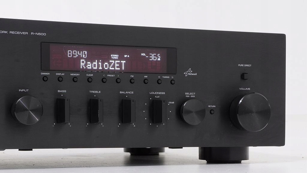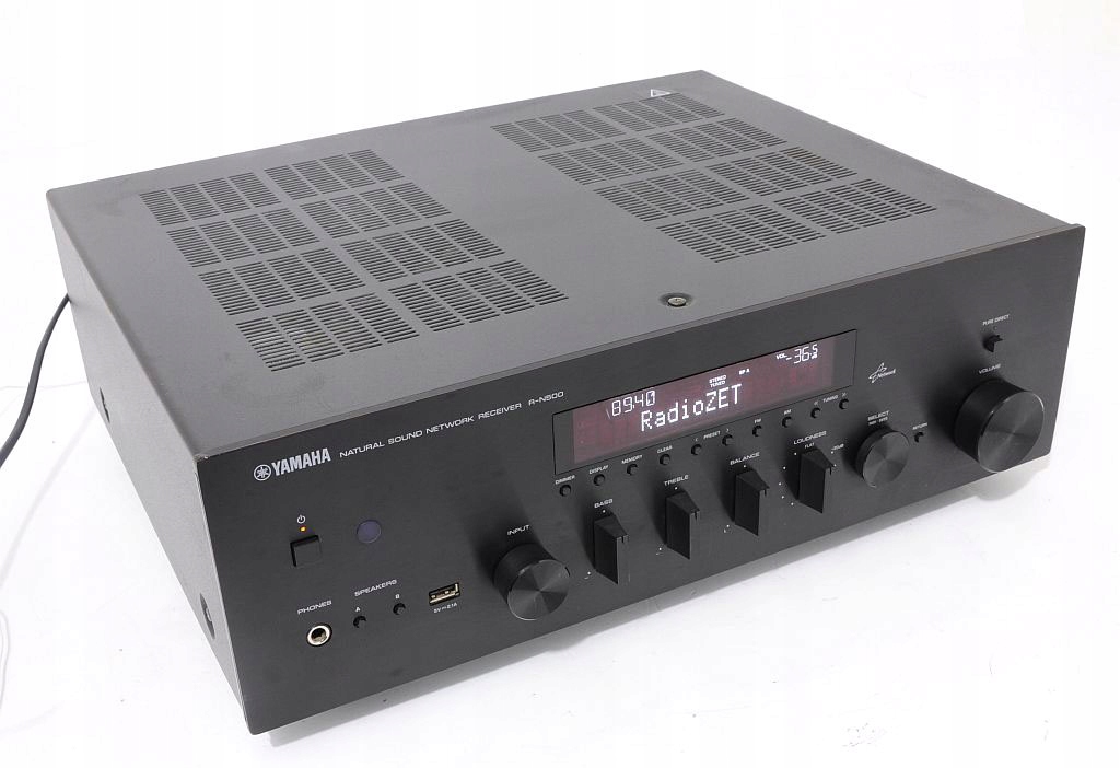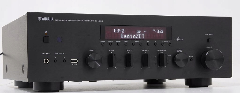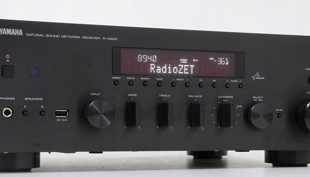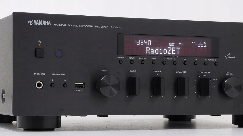 Regulacja wzmocnienia w amplitunerze Yamaha R-N500 jest także elektroniczna, przedni panel wypełniają jeszcze przyciski obsługi tunera analogowego, któremu urządzenie zawdzięcza swoją nazwę, ale przecież nie mniej ważne jest podręczne wejście USB, do którego podłączymy zarówno nośniki pamięci, jak i sprzęt Apple. Producent oferuje pilota wirtualnego, a więc aplikację sterującą amplitunerem Yamaha R-N500, którą możemy zainstalować na smartfonie lub tablecie.