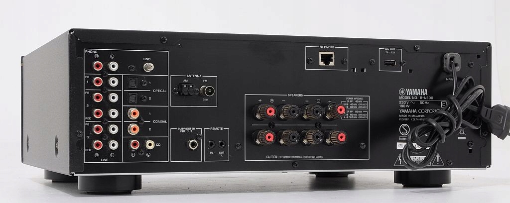 Tylny panel amplitunera Yamaha R-N500 przedstawia mnóstwo możliwości połączeń i konfiguracji. Na pewno jednym z najważniejszych gniazd jest sieciowe LAN, Yamahę podłączamy klasyczną skrętką, ale jeśli nie mamy (lub nie chcemy doprowadzać) kabla, możemy kupić opcjonalny adapter Wi-Fi; dla niego przygotowano dodatkowe USB z tyłu, które pełni tylko rolę źródła zasilania.
