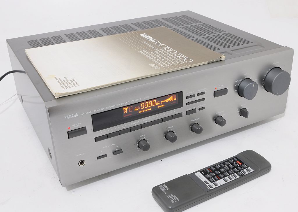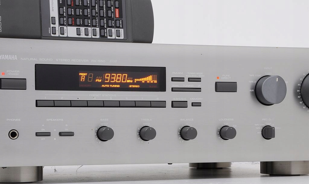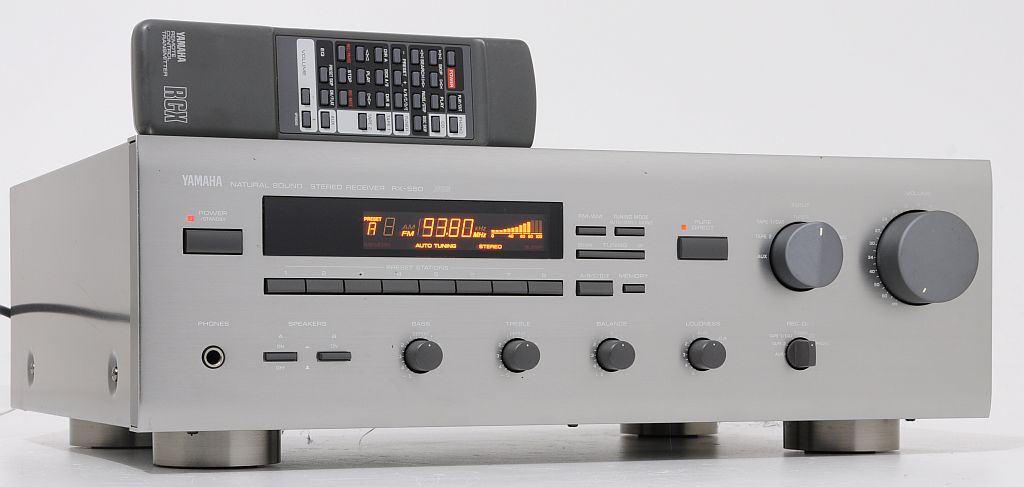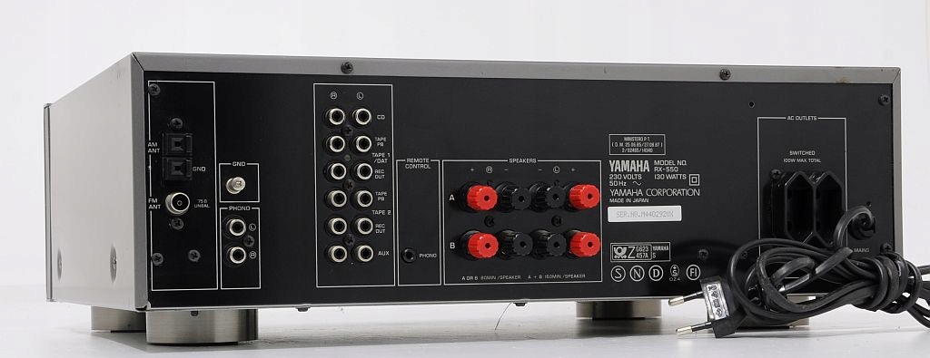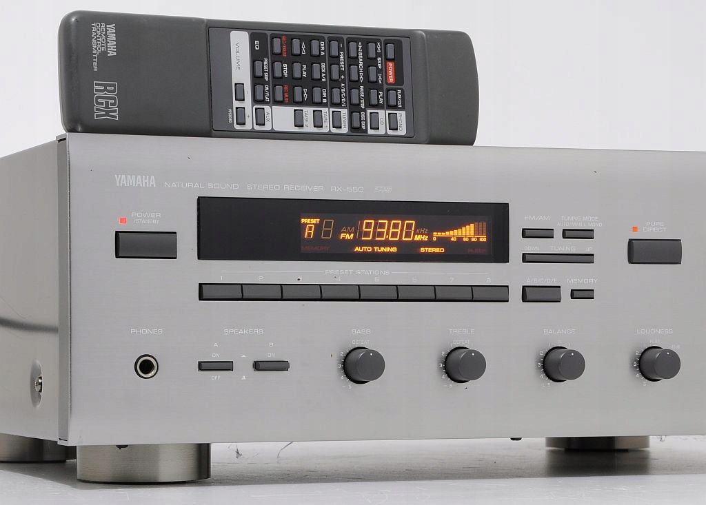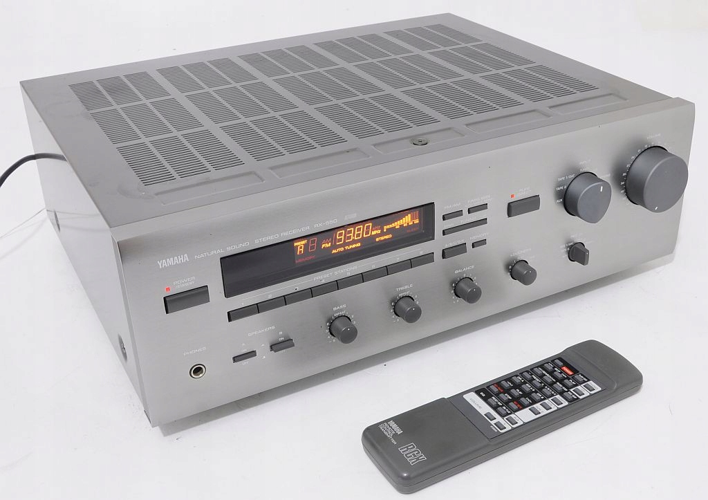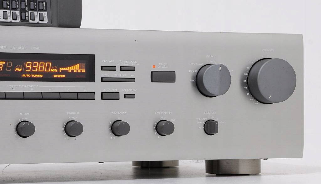 Solidny amplituner YAMAHA z potężnym układem wzmacniacza. YAMAHA RX-550 jest sprzętem w klasie urządzeń do 2000,00zł – co ciekawe gra lepiej niż tzw. niewypały czyli flagowe wzmacniacze AX 980 czy AX1080, RX w odróżnieniu do wcześniej wspomnianych brzmi świeżo – ma bardzo dobrą stereofonie jak na tej klasy sprzęt . W środku jak w starym dobrym klasyku – solidne trafo kondensatory Nichicon, końcówka mocy oparta na tranzystorach (4 x SanKen), układ symetryczny – dwa osobne radiatory (jeden do prawego kanału drugi do lewego), tor przedwzmacniacza, krótki, prosty bez zbędnych udziwnień, kondesatory ELNA For Audio, przekaźniki DEC. Standardowo u Yamahy występuje opcja – płynnie regulowanego LOUD`u, nie inaczej jest w tym przypadku :) Przycisk „puer direct” umożliwia odsłuch sygnału bezpośrednio ze źródła z pominięciem wszelkich korekcji (pokrętła bass/sopran). Sprzęt jest w świetnym stanie, nie był naprawiany, wszystkie komponenty oryginalne. Sekcja tunera sprawuje się znakomicie, bardzo ładnie ściąga, odbiera stacje radiowe, zero kłopotów z trybem stereo.