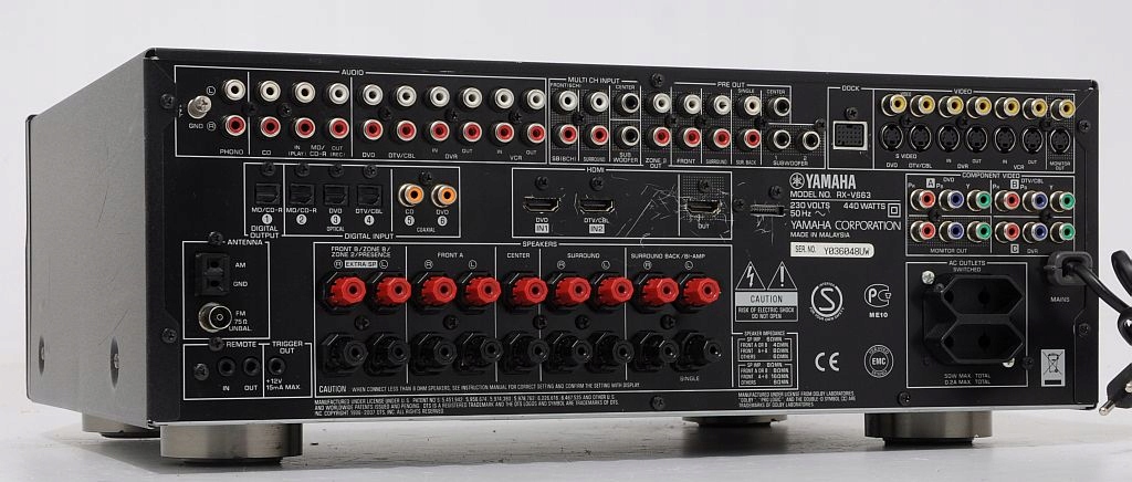 Pod względem przyłączeniowym RX-V663 jest wyposażony fantastycznie. Dla cyfrowych sygnałów audio są zarówno wejścia elektryczne (dwa), jak i optyczne (trzy), a nawet jedno wyjście w tym ostatnim standardzie. Jest przedwzmacniacz gramofonowy, a wyjścia subwooferowe są dwa.